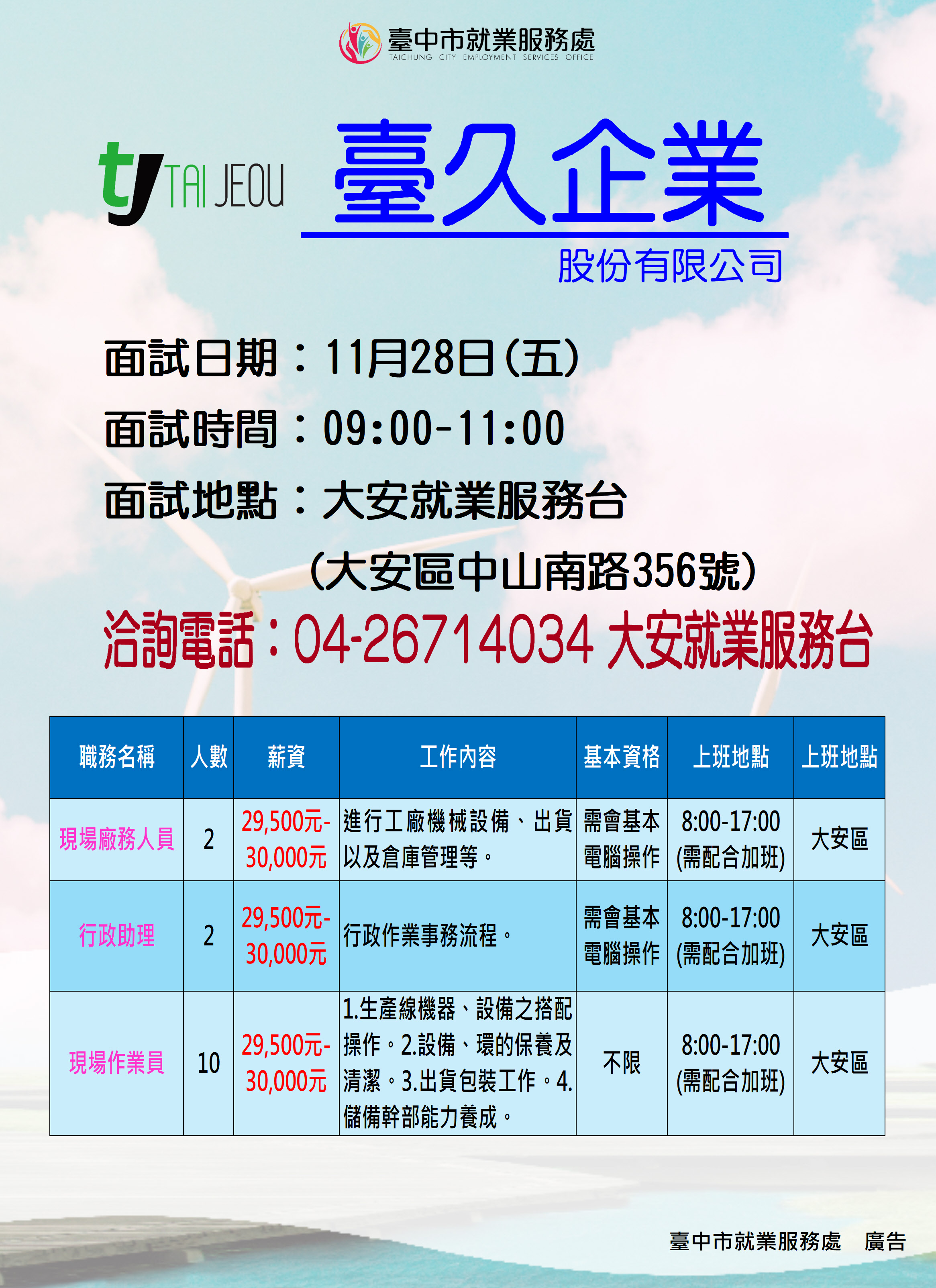 性 質:單一廠商徵才活動 活動時間:11/28(五)09:00-11:00 活動地點:大安就業服務台(大安區中山南路356號) 廠商名稱:臺久企業股份有限公司 廠商地址:台中市大安區海墘里東西六路二段193號 工作地點:台中市大安區海墘里東西六路二段193號 職 缺 一:行政助理(2名) 工作內容:行政作業事務流程。 工作時間:08:00-17:00,周休二日 基本資格:需會電腦基本操作。 薪資待遇︰29500~30000元 職 缺 二:現場廠務人員(2名) 工作內容:進行工廠機械設備、出貨以及倉庫管理等。 工作時間:08:00-17:00,周休二日 基本資格:需會電腦基本操作。 薪資待遇︰29500~30000元 職 缺 三:現場作業員(10名) 工作內容:1.生產線機器、設備之搭配操作。2.設備、環境的保養及清。潔3.出貨包裝工作。4.儲備幹部能力養成。 工作時間:08:00-17:00,周休二日 基本資格:不拘 薪資待遇︰29500~30000元 |
