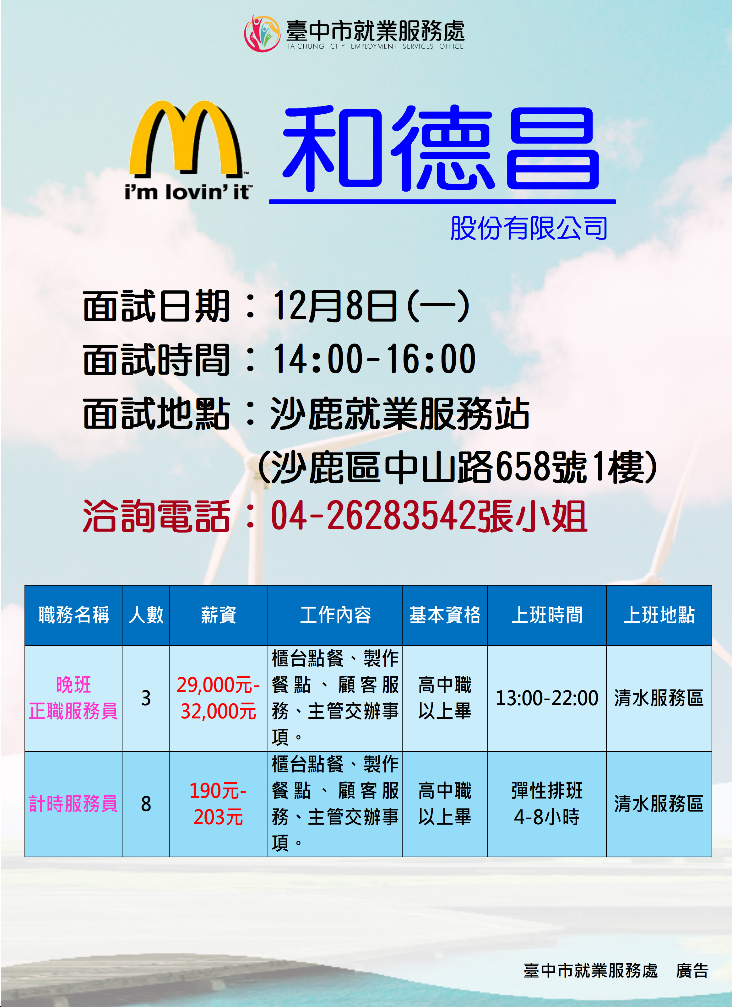 性 質:單一廠商徵才活動 活動日期:12/08(一) 下午2:00-4:00 活動地點:沙鹿就業服務站(沙鹿區中山路658號1樓) 廠商名稱:和德昌股份有限公司 廠商地址:臺中市清水區吳厝二街89號 工作地點:臺中市清水區吳厝二街89號 職 缺 一:晚班正職服務員(3名) 工作內容:櫃台點餐、製作餐點、顧客服務、主管交辦事項。 工作時間:13:00-22:00 基本資格:高中職以上畢 薪資待遇:29,000-32,000元 職 缺 二:計時服務員(8名) 工作內容:櫃台點餐、製作餐點、顧客服務、主管交辦事項 工作時間:彈性排班4-8小時 基本資格:高中職以上畢 薪資待遇︰時薪190-203元 |