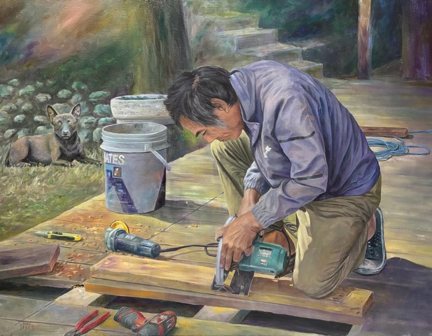 許圳至1962出生於雲林縣麥寮鄉新吉村。「島嶼流影-勞動者的畫卷」是許圳至以畫筆描繪島嶼的日常風景。他將目光投向田間、港口與各行各業平凡的身影,以樸實筆觸捕捉沉靜而堅韌的力量。這些畫中人,映照出臺灣人生命的韌性與團結互助的精神。作品不僅是對生活的致敬,也是對這片土地的深情凝視,願觀者在畫中看見勤勞、樸實與溫厚的力量,看見人與土地交織出的光。