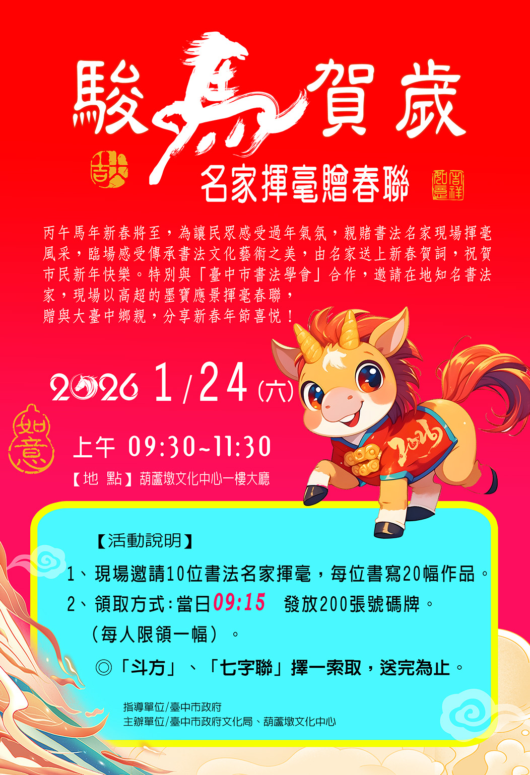 丙午馬年新春將至,為讓民眾感受過年氣氛,親賭書法名家現場揮毫風采,臨場感受傳承書法文化藝術之美,由名家送上新春賀詞,祝賀市民新年快樂。特別與「臺中市書法學會」合作,邀請在地知名書法家,現場以高超的墨寶應景揮毫春聯,贈與大臺中鄉親,分享新春年節喜悅!