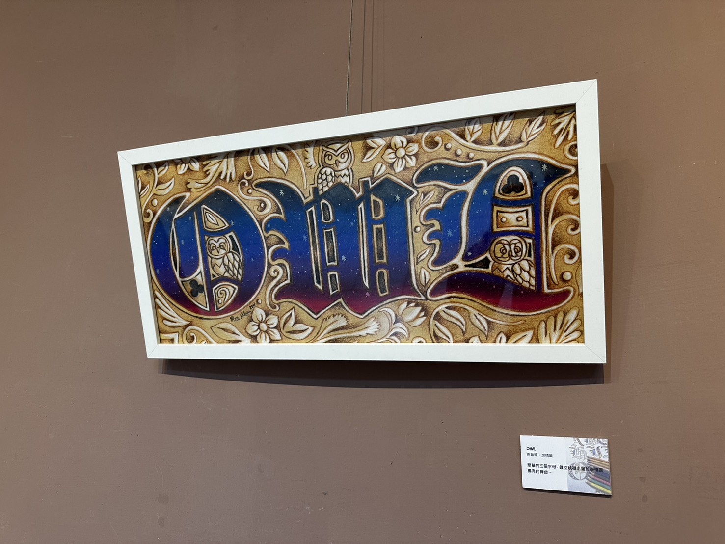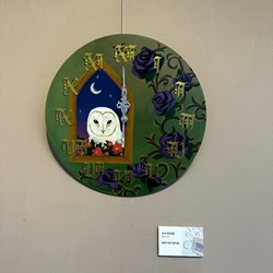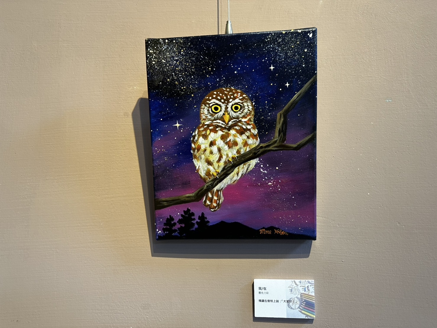 本次展出的藝術家創作媒材多元,主題以貓頭鷹居多,精選多幅色鉛筆畫作及壓克力顏料彩繪作品