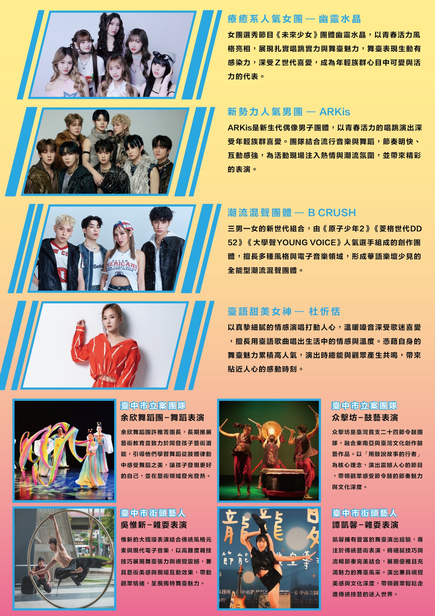 更多活動介紹請參閱「臺中媽祖國際觀光文化節─大甲鎮瀾宮周邊演藝活動」粉絲專頁(連結如下)。