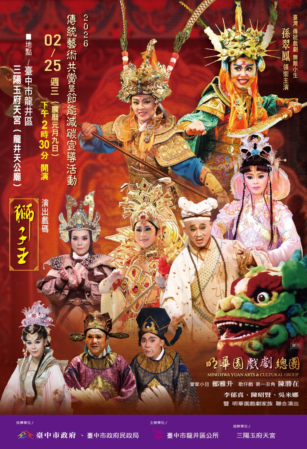 本次在龍井三陽玉府天公演出的《獅子王》,將由第一代獅王孫翠鳳與親傳弟子、也是明華園總團重點培育的新生代小生李郁真,以傳承版的形式共同演出。除了兩代獅王,傳統戲劇第一丑角陳勝在飾演文殊菩薩化身的老鼠和尚、當家花旦鄭雅升飾演溫柔機智的樓麋公主,還有其他包括吳米娜、黃筱媛、陳彥名等總團新生代精銳共同演出,聲勢浩大。