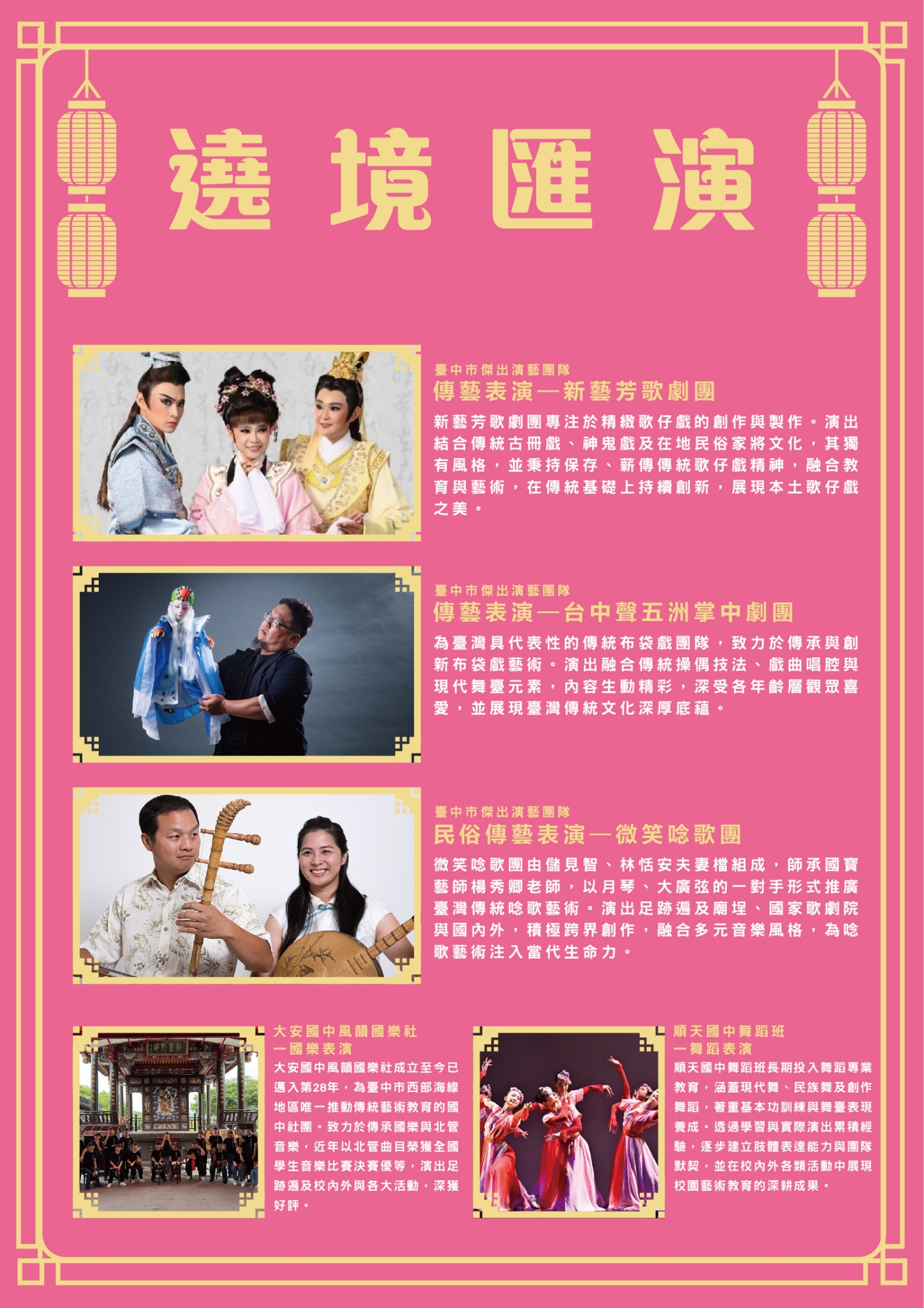 - 演出團隊:順天國中舞蹈表演、大安國中國樂表演、微笑唸歌團、新藝芳歌劇團及台中聲五洲掌中劇團等優質演藝團隊