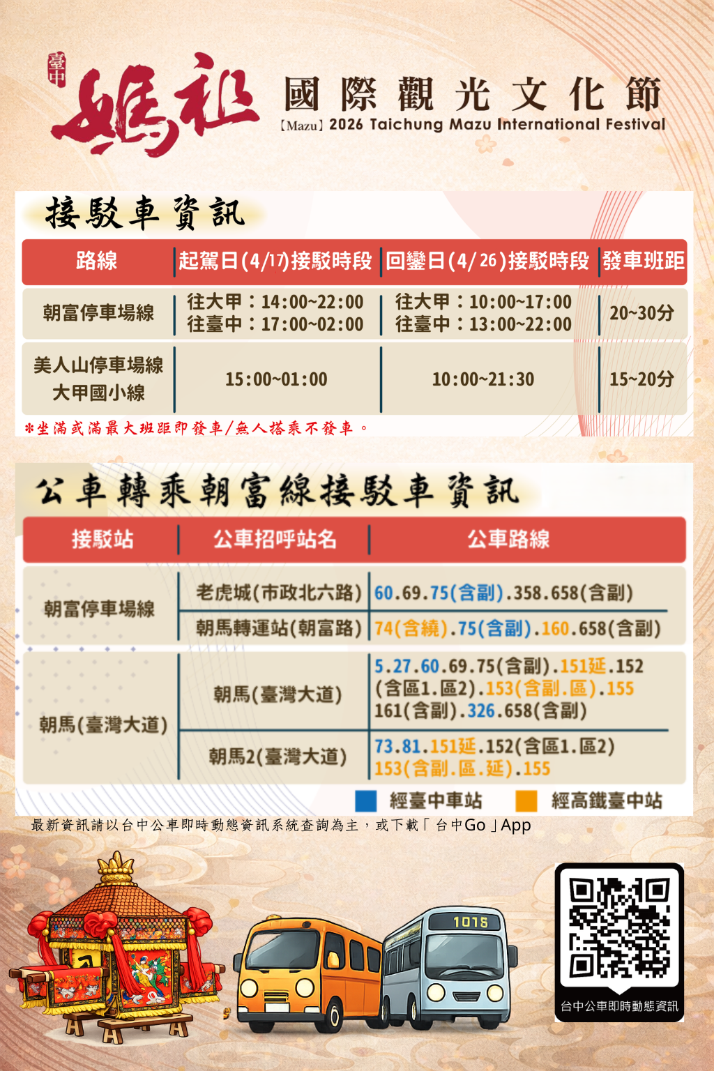 - 為提供參與民眾便捷交通,4月17日媽祖起駕日和4月26日回鑾日接駁車資訊,請參閱附檔,如有疑問,請洽交通局吳小姐(04-22289111#61221)。