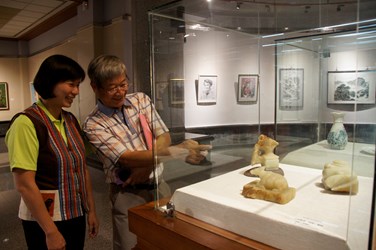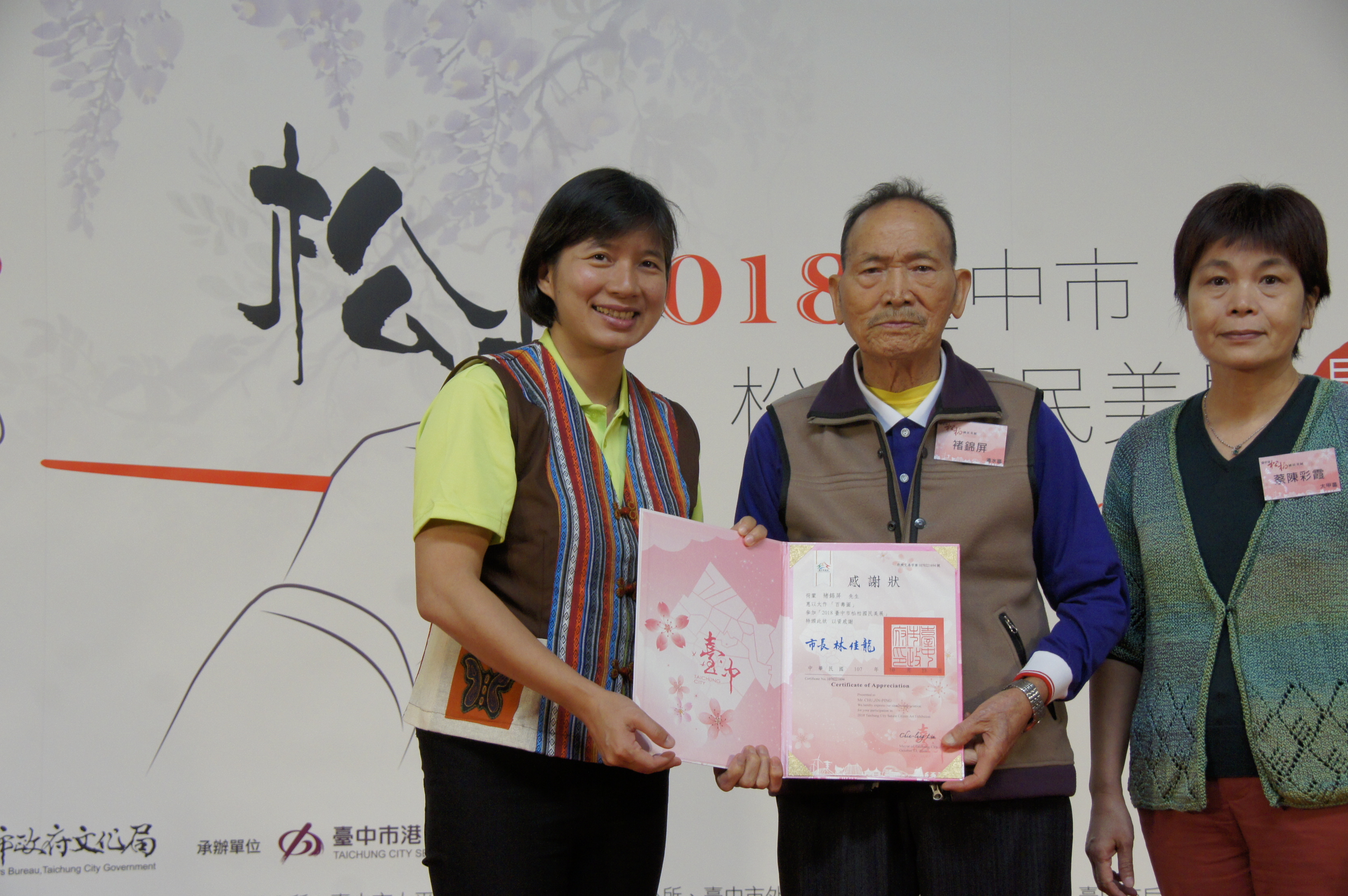 今年有2位高齡90餘歲,20位80餘歲長者參展。來自大甲區的蔡陳彩霞女士(民國14年生),展出作品《雙喜》,用藺草編織「囍」圖案,在草枝斜行的平面中,呈現直紋與橫紋的立體變化;而清水區的褚錦屏先生(民國18年生),展出書法作品《百壽圖》,用全開紅宣紙書寫一百個小篆壽字,字體各異,筆力遒勁。