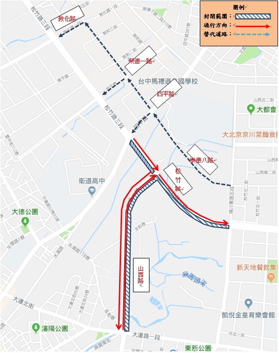 位於14期市地重劃工程範圍內的松竹路三段(梅川東路五段至四平路間)及山西路,為進行排水箱涵、汙水系統、人行道及路面整建等工程,松竹路東行方向(四平路往梅川東路)將於5月18日起封閉施工,開放西行車道通行,山西路(大連路至松竹路間)部分車道也將封閉,請用路人車輛行經交通管制區域時減速慢行,並依交管人員引導及指示牌面說明行駛。