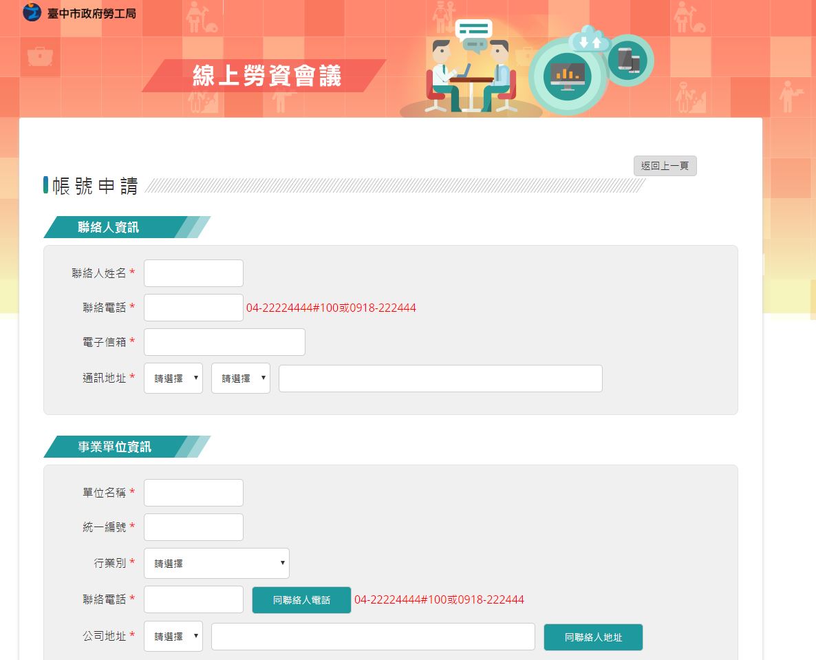 勞資會議線上註冊網址:http://lbms2.taichung.gov.tw/LMCR/login.aspx,台中市事業單位如有勞資會議相關問題,可洽勞工局勞資關係科,聯絡電話:(04)22289111分機35111、35114、35116或35118。另勞資會議流程圖及相關表單可至勞工局網站下載,網址:http://www.labor.taichung.gov.tw/首頁─勞資會議專區─勞資會議流程圖、相關表單及格式項下。(5/26*7)*勞工局