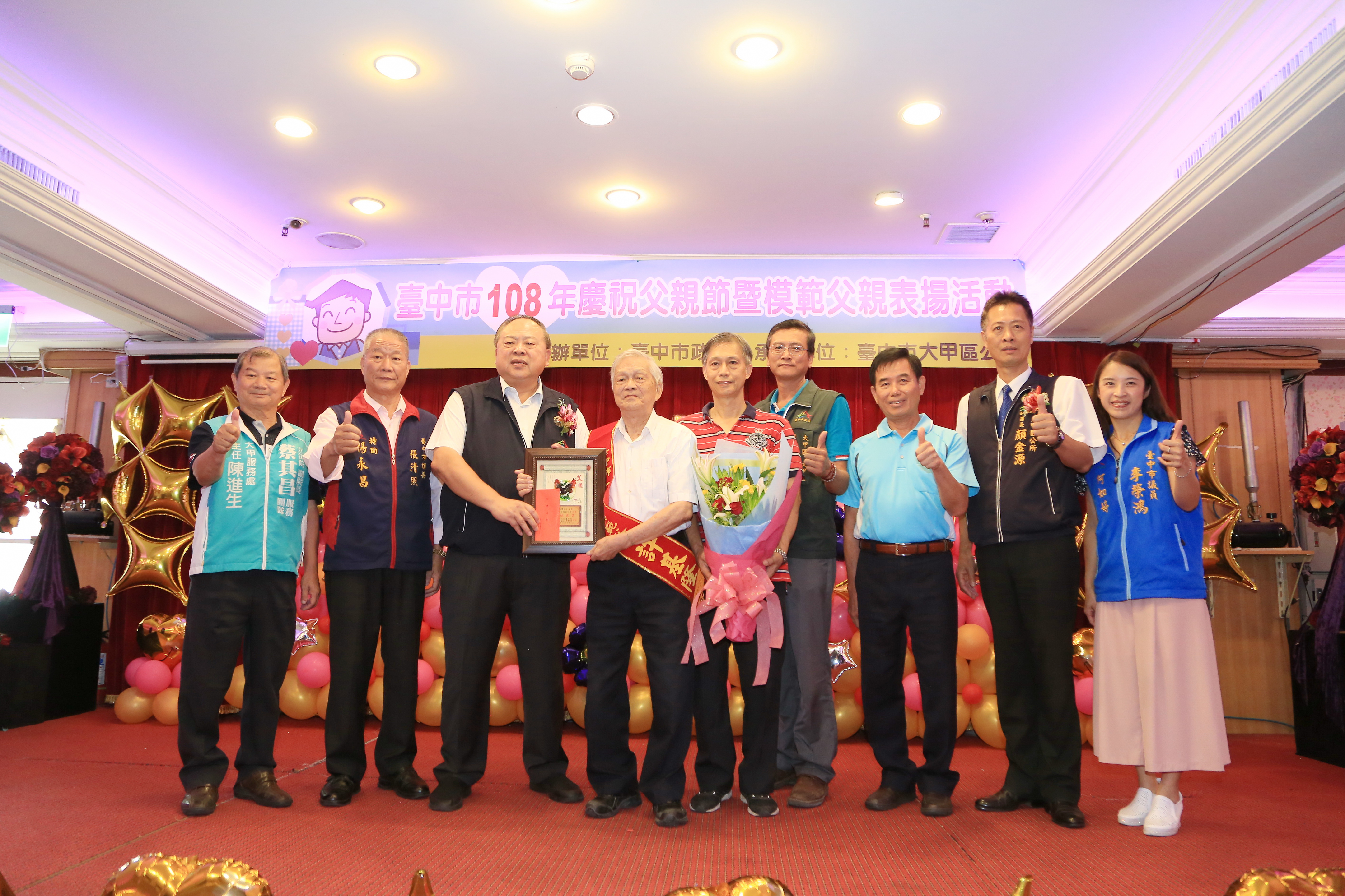 父親節即將到來,台中市大甲區今(2)日舉行108年模範父親表揚活動,由身為大甲在地人的副市長陳子敬表揚29位各里所推薦的模範父親代表,感謝這些父親們在家庭與社會所做的貢獻,並預祝在場模範父親不止「父親節快樂」,也要「天天都快樂」。