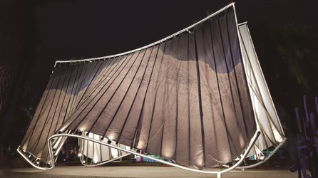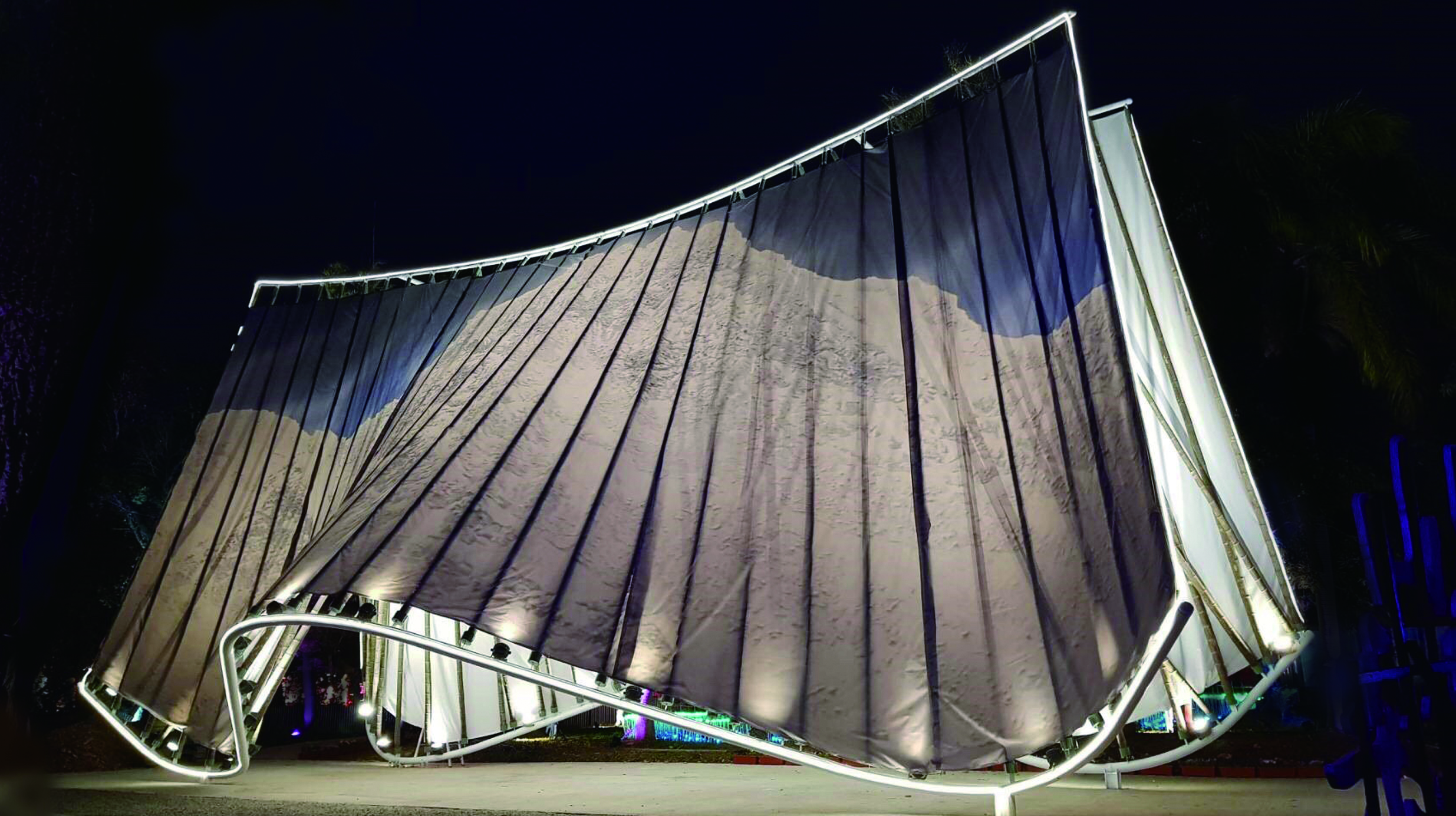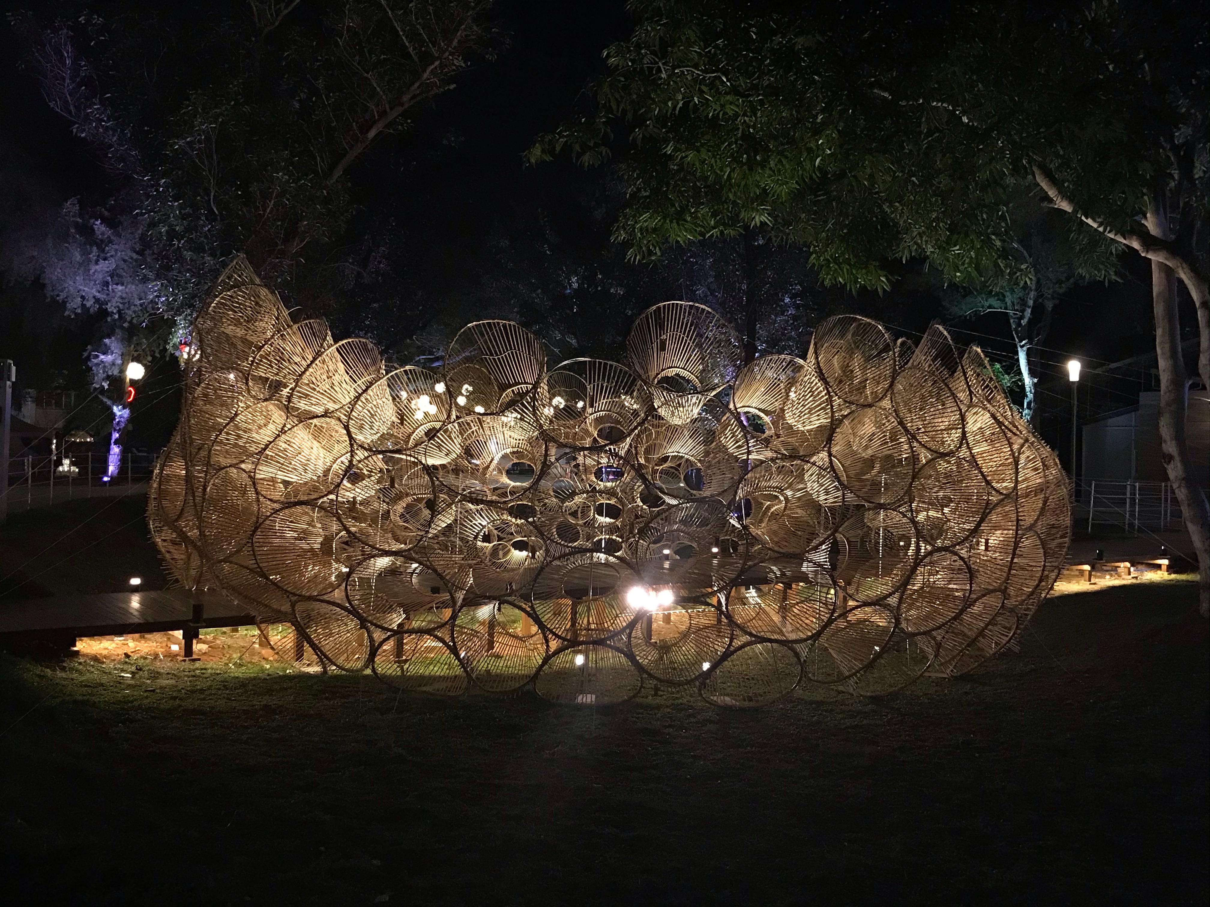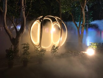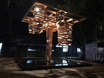 現場還展出與上百位在地居民協力製作的「源流—筌屋IV后里」,協力編織數百個魚筌單元體,其他燈飾如「纍纍樹光」利用薄片柳杉製作光果燈組,光穿透出柳杉上自然紋理的美,聳立在黑卵石的水盤中,呈現層層疊疊的倒影;「森光霧果」用交織的木條,建造出一顆空心的松果,曲木構成的發光體擺放在群樹下,點亮森林。