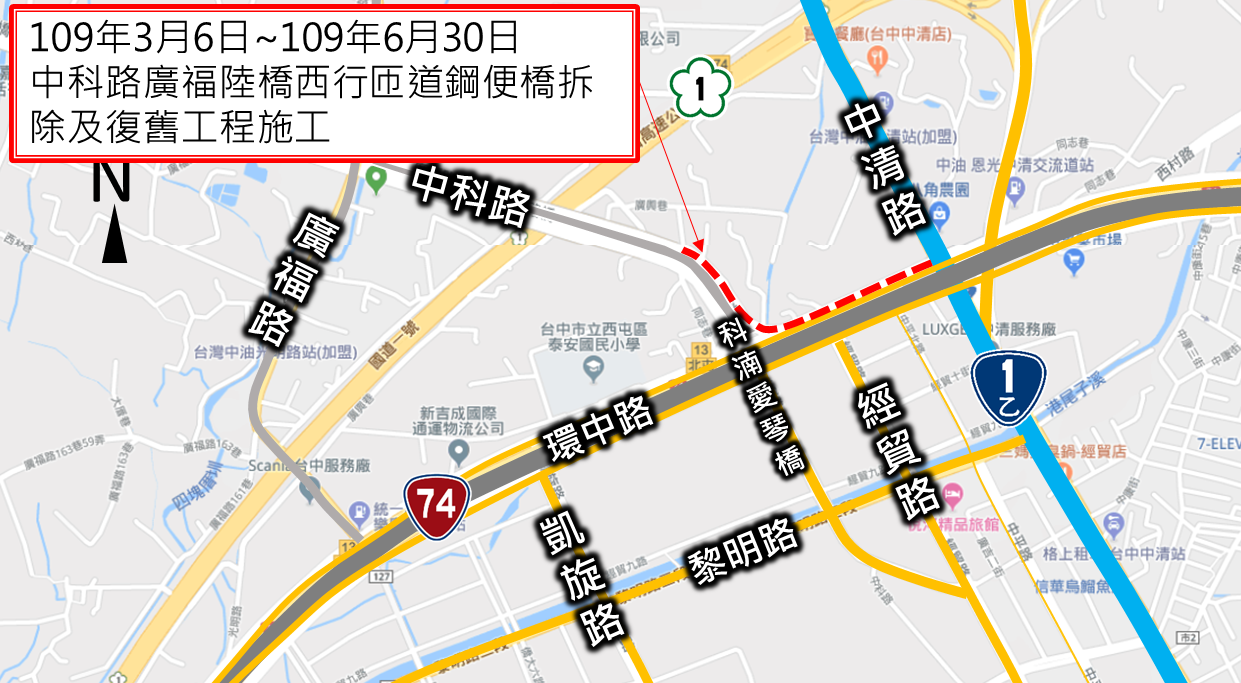 建設局說明,科湳愛琴橋新建期間為進行路堤銜接段工程,縮減中科路廣福陸橋通行車道,市府另於西行方向設置臨時鋼便橋,維持廣福陸橋雙車道通行,以減少施工期間交通影響。