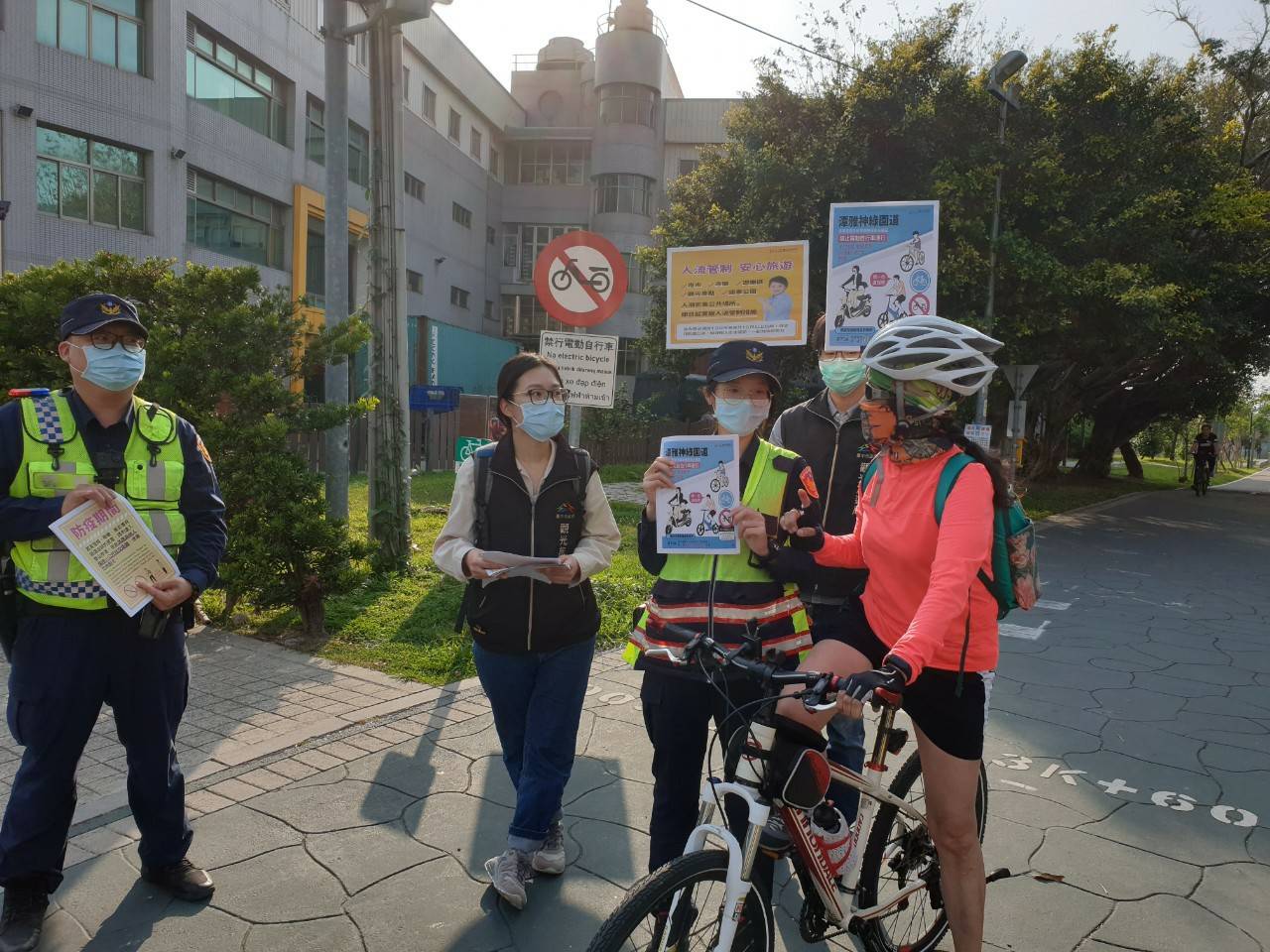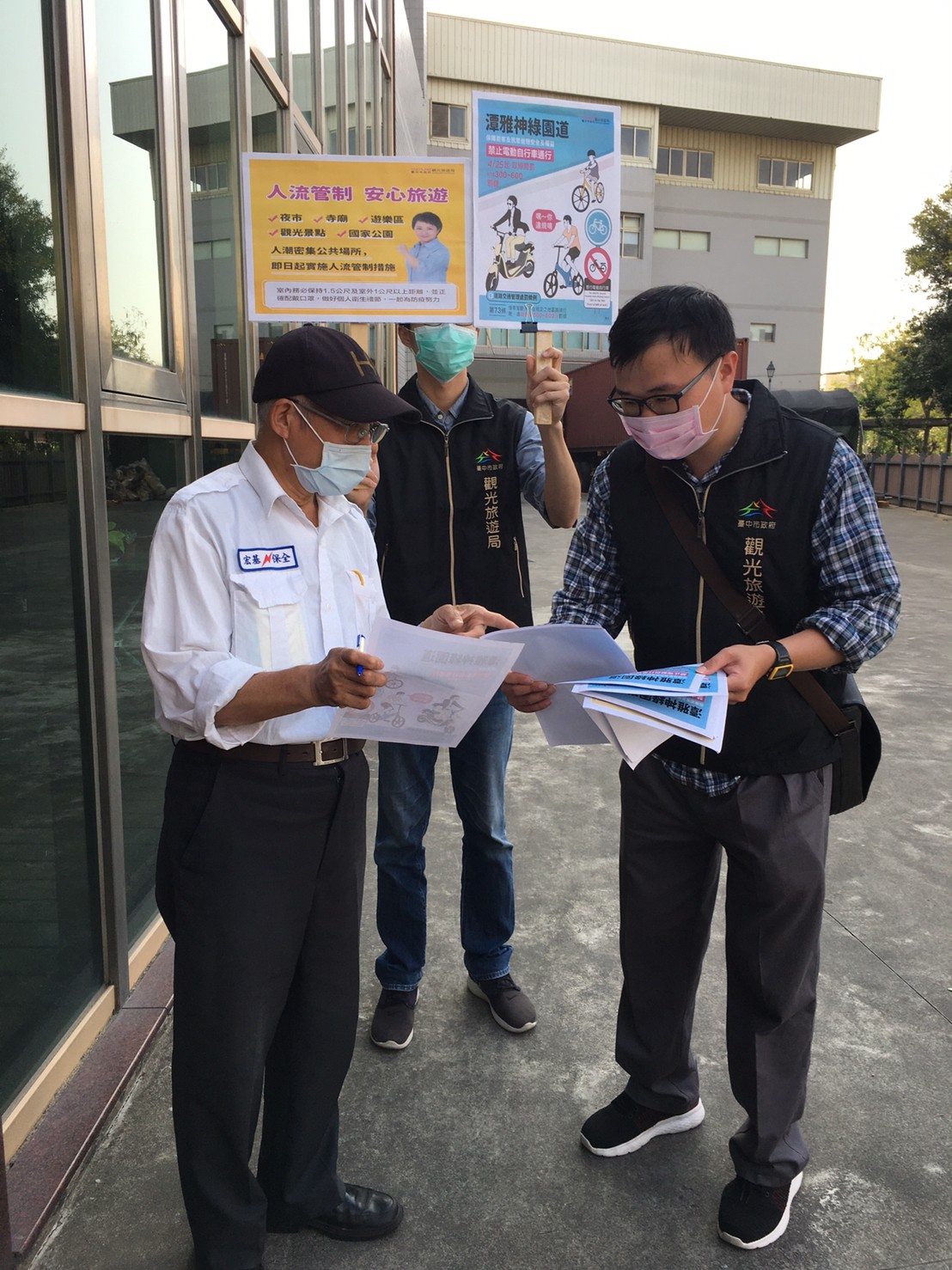 因應新冠肺炎疫情,觀旅局同仁除會同警察局於現場取締違規案件外,也配合中央防疫措施,於潭雅神綠園道周邊人潮聚集等重要節點向業者及遊客宣導勤洗手、配戴口罩、保持室內1.5公尺及室外1公尺以上之社交距離,共同落實全民防疫工作。(4/25*6)*觀光旅遊局