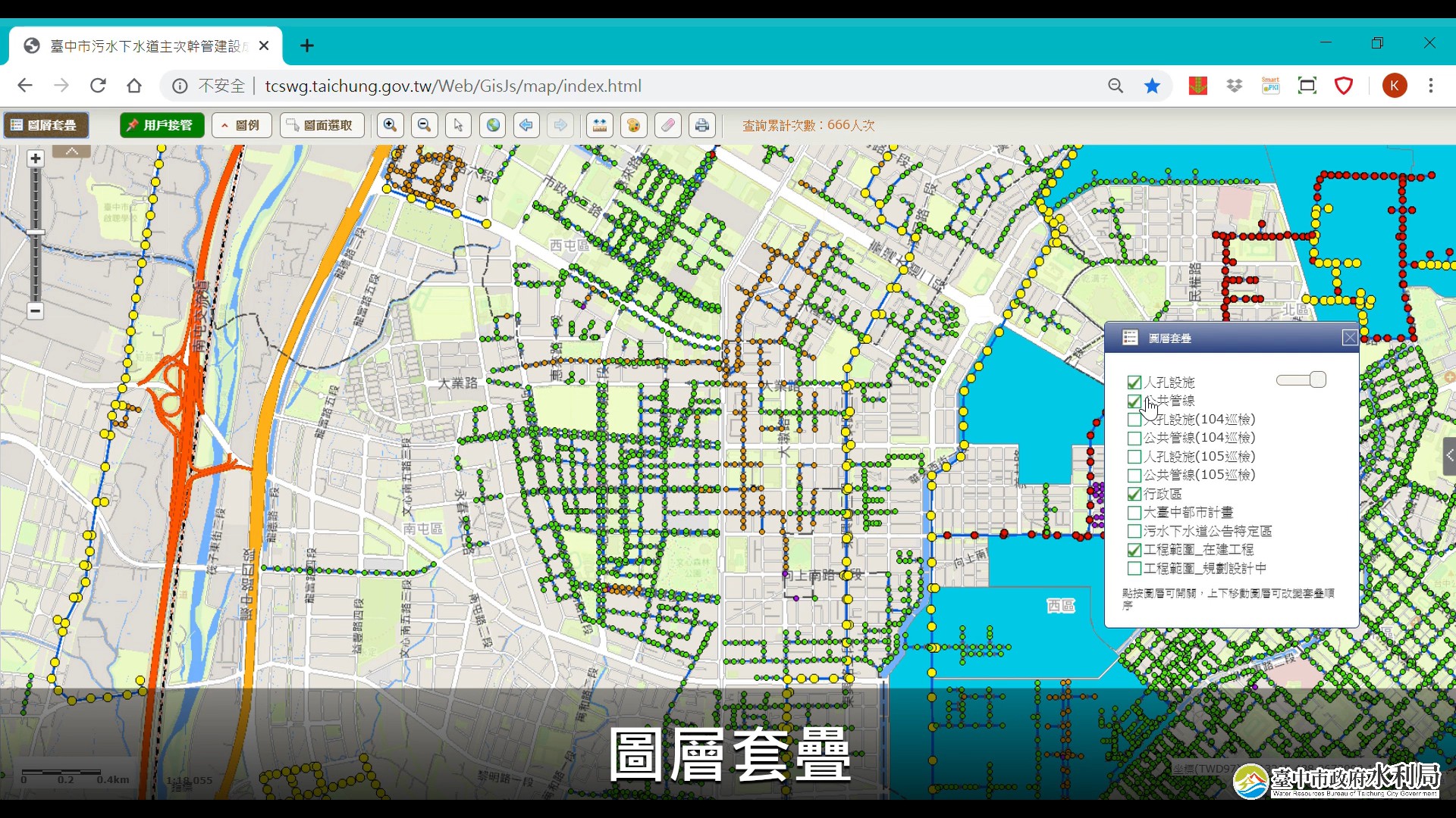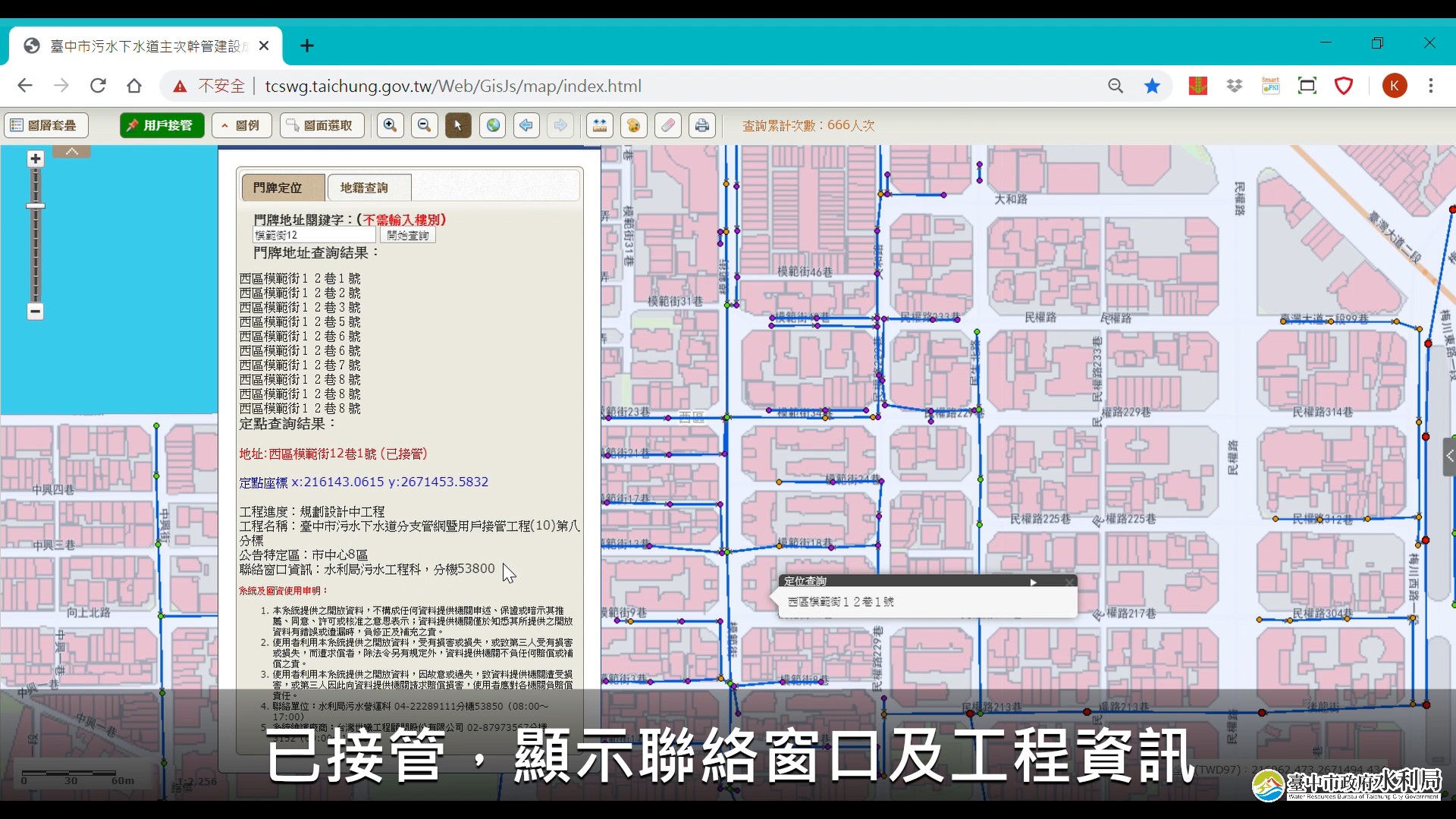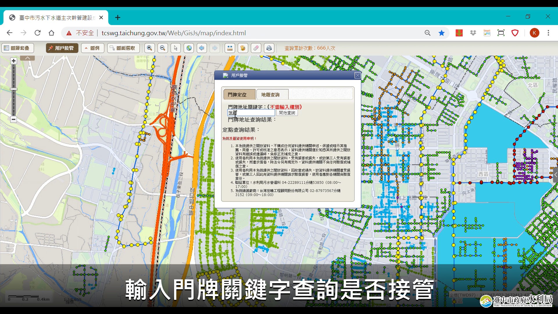 水利局補充,期透過台中市汙水下水道建設與營運管理線上整合服務,提供市民更完整的汙水接管工程相關資訊,秉持「服務零時差,接管看得見」理念,快速且有效地回應市民需求,邁向新世代汙水接管查詢新紀元。平台連結:http://tcswg.taichung.gov.tw/Web/GisJs/map/。