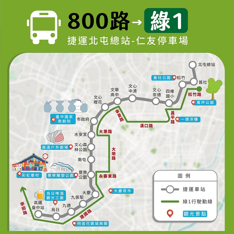 交通局表示,800路公車「捷運北屯總站 - 仁友停車場」原規劃作為捷運綠線先導公車,於捷運綠線重疊路段僅跳蛙式停靠捷運車站,捷運綠線通車後,800路公車完成階段性任務,路線編號將改為綠1,並將調整部分路段改行駛漢口路及大墩路等地區,增停沿線既有公車站位;53路「太原車站-省議會」沿線行經文心路及文心南路,與捷運綠線大幅度重疊,因此路線裁切為綠2「太原車站-捷運文心森林公園」及綠3「台中市議會-省議會」兩路線,提升路線行駛效率。