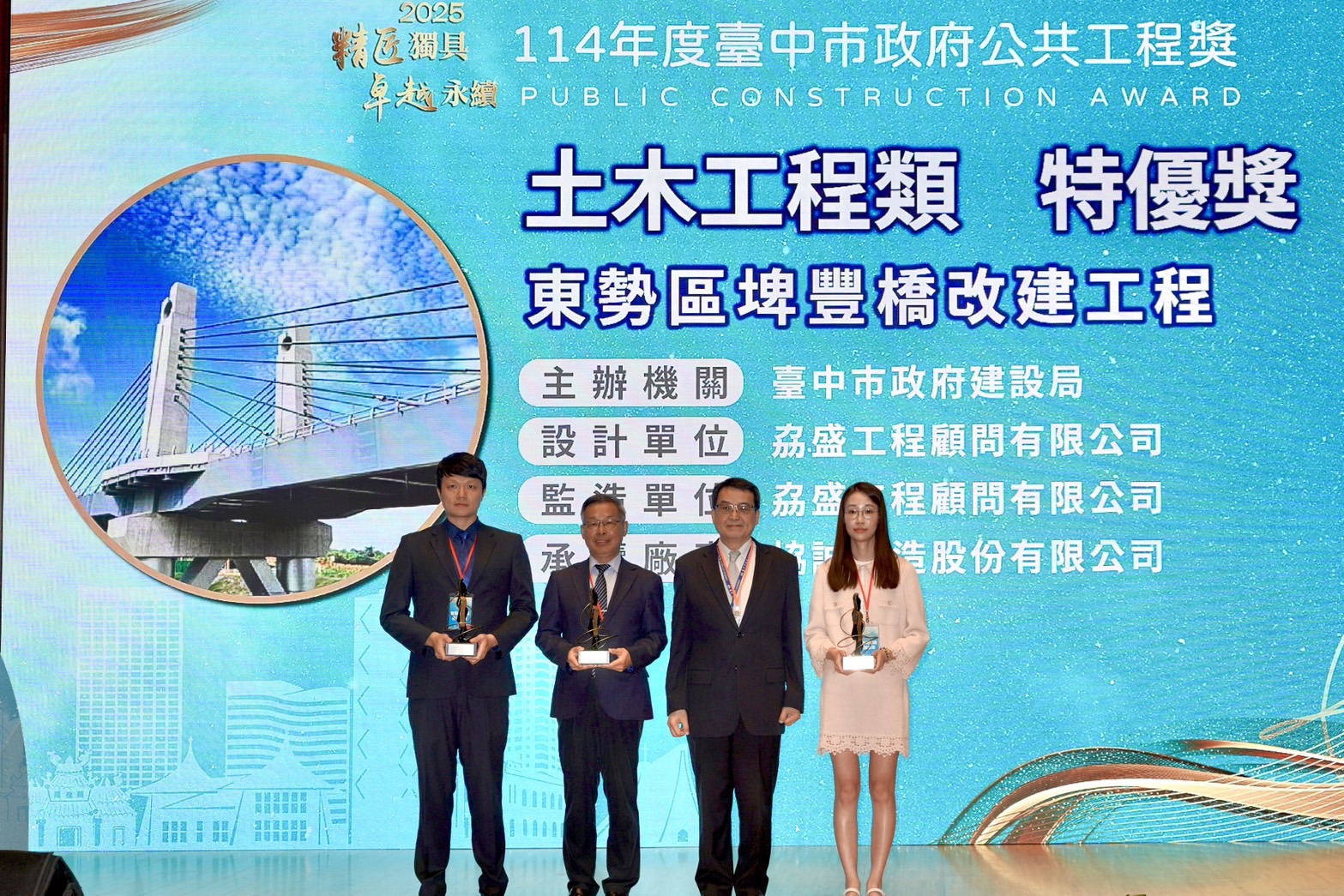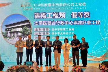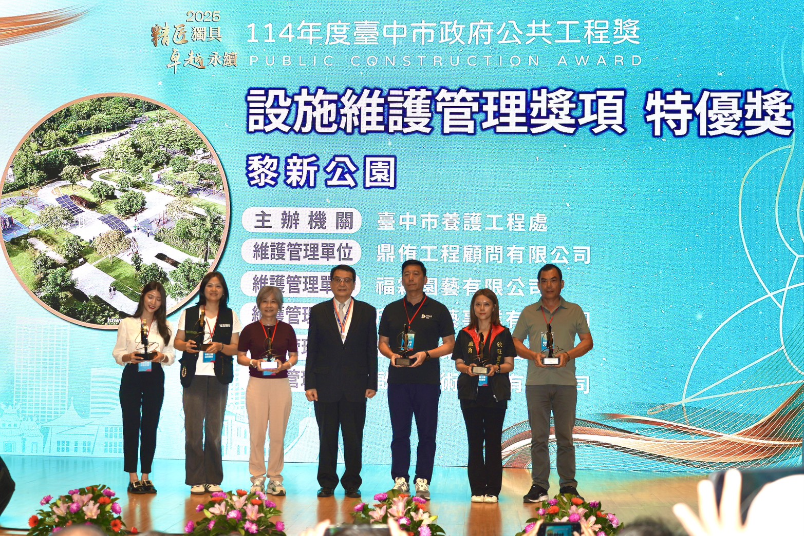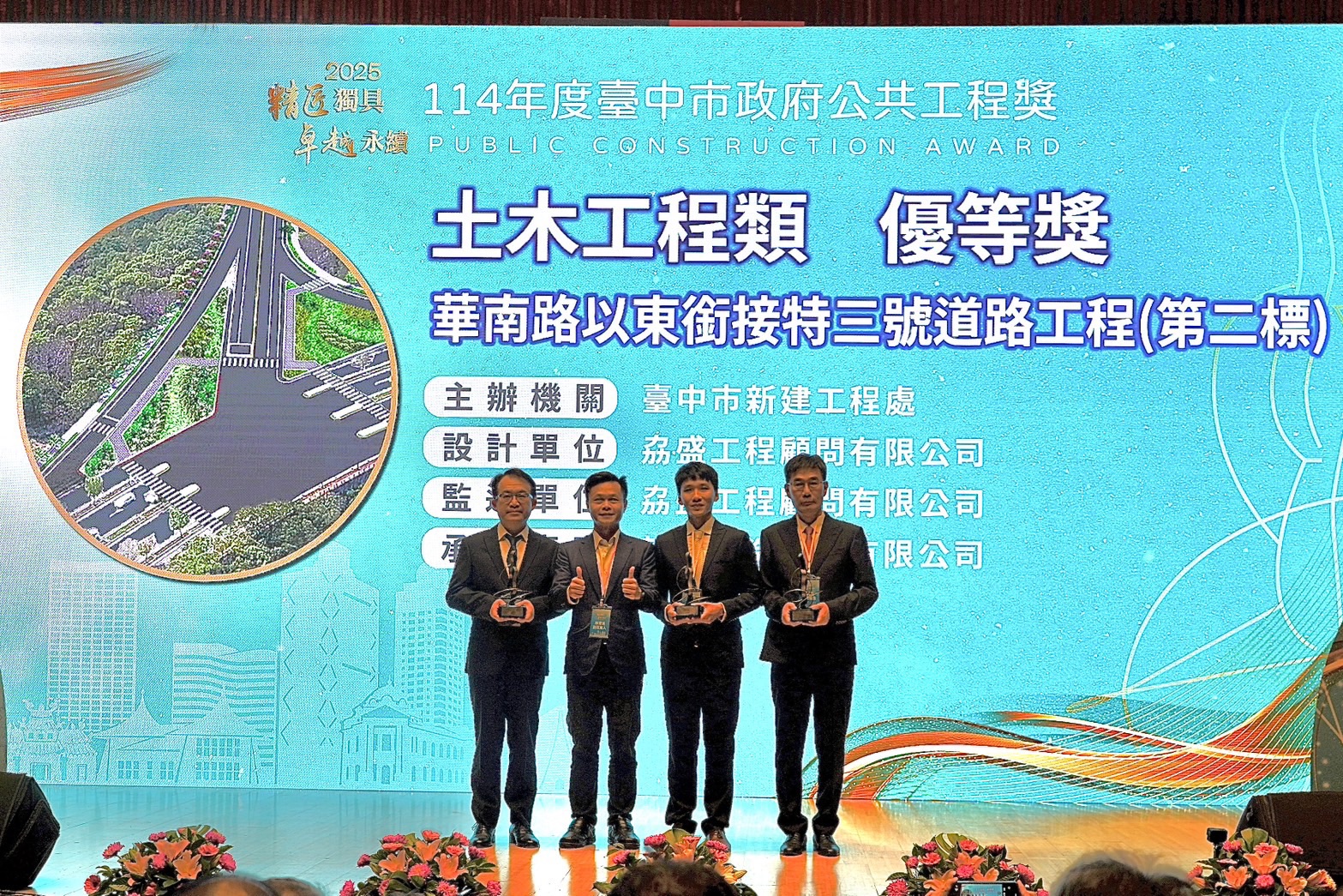 台中市政府今(29)日盛大舉辦「114年第三屆公共工程獎」頒獎典禮,建設局表現搶眼,橫掃土木工程類、建築工程類、設施維護管理類及個人貢獻獎等多項榮譽,共抱回11項大獎,成為全場最大贏家;獲獎工程涵蓋交通建設、公共空間、友善環境等領域,展現市府推動重大建設的卓越實力與多元成果。