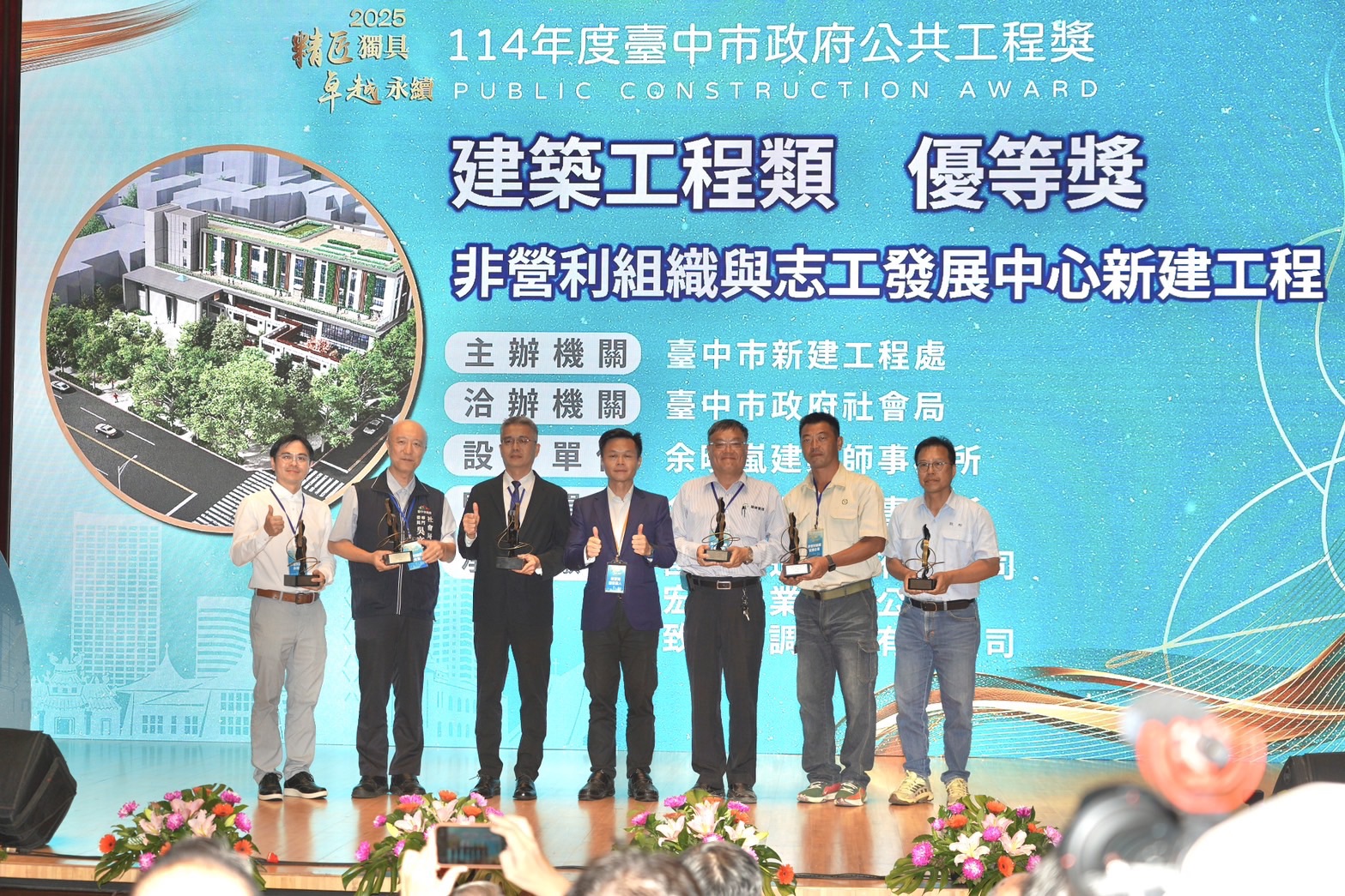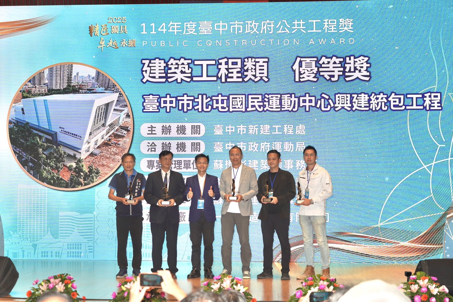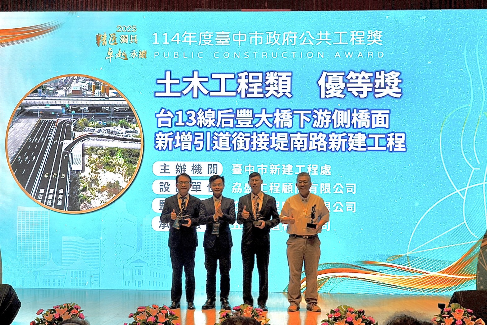 台中市政府今(29)日盛大舉辦「114年第三屆公共工程獎」頒獎典禮,建設局表現搶眼,橫掃土木工程類、建築工程類、設施維護管理類及個人貢獻獎等多項榮譽,共抱回11項大獎,成為全場最大贏家;獲獎工程涵蓋交通建設、公共空間、友善環境等領域,展現市府推動重大建設的卓越實力與多元成果。