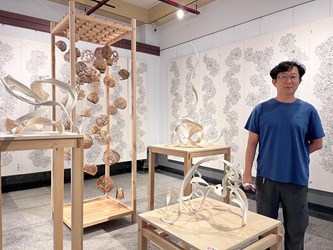 方世河《遇見源頭》以水墨菊花、柚子皮與鐵絲建構立體裝置,展現對材質的敏感掌握。作品象徵創作與生命的回返,技法與直覺交融,如淡淡詩句,藏著深刻情感。