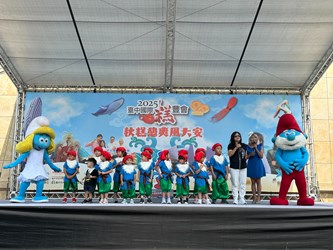 「2025台中國際踩舞嘉年華」的踩舞暖身快閃活動,今(14)日來到大安港媽祖文化園區,藍色小精靈coser與大型人偶同台亮相,吸引大批遊客前來互動合影,直呼小時候的回憶不斷湧上。台中市政府觀光旅遊局指出,小朋友跟著音樂律動,目光聚焦在藍色小精靈,現場民眾與藍色小精靈共度歡樂的周末,期待9月27、28日在清水盛大登場的「2025台中國際踩舞嘉年華」!