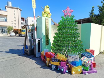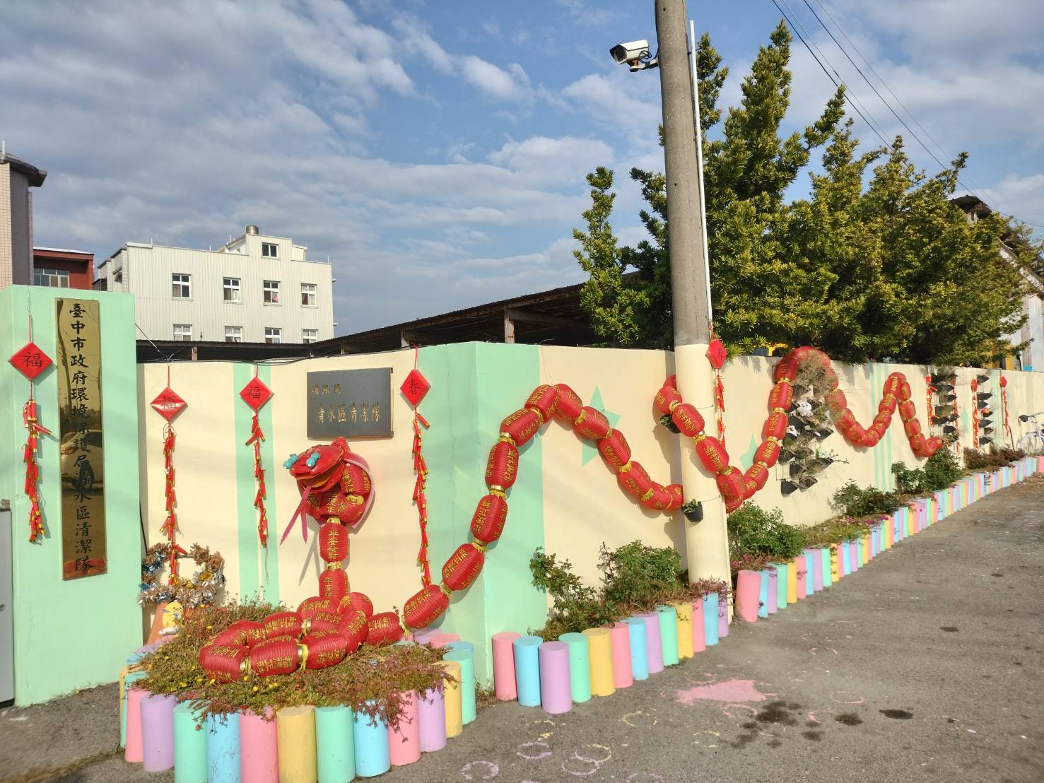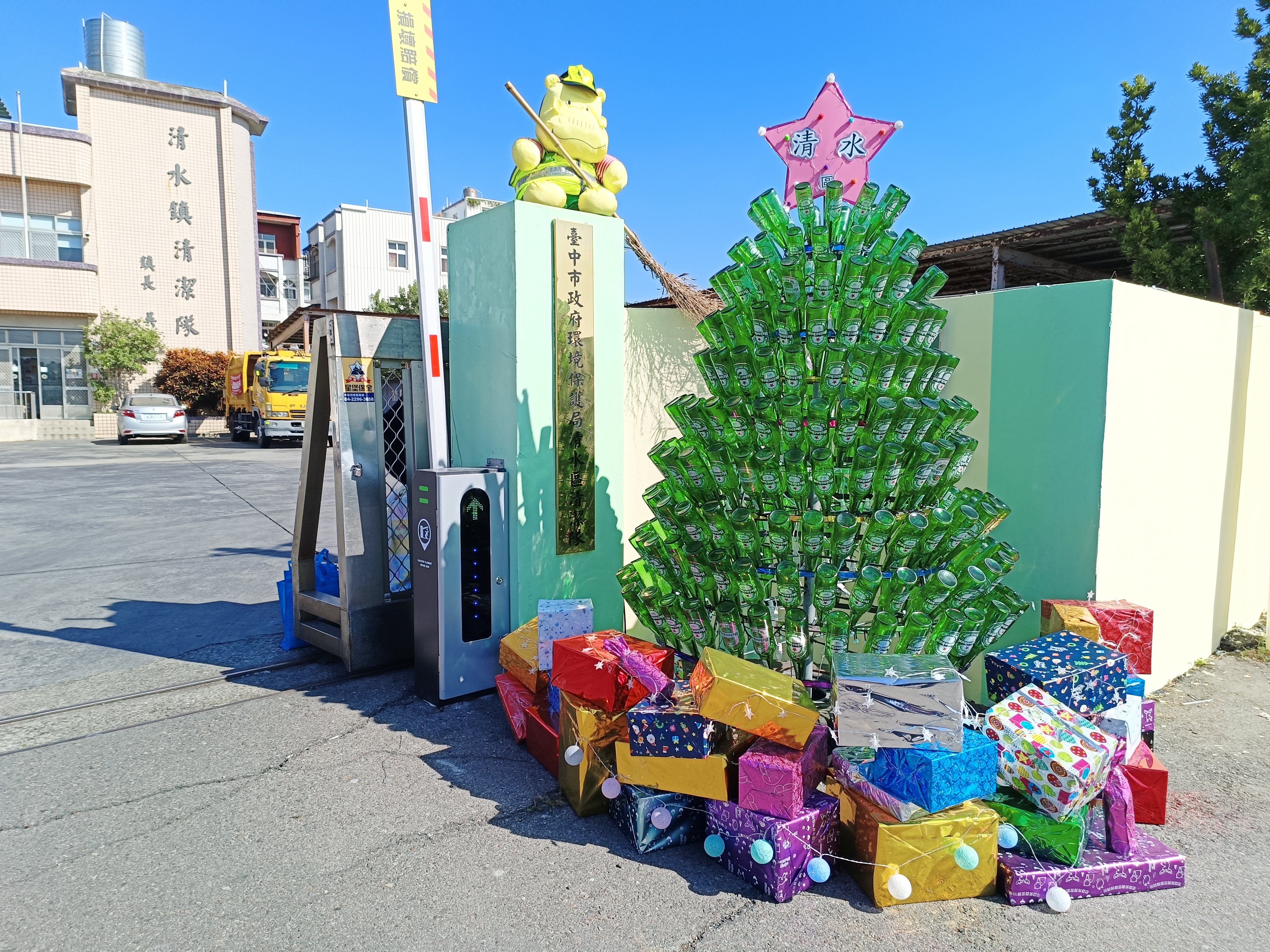 此外,一般人對於清潔隊的刻板印象多是與垃圾為伍,為扭轉印象、翻轉創意、打造不一樣的清潔隊,邱隊長更帶領同仁將原本斑駁脫漆的外牆,打造成馬卡龍風格綠美化植栽,結合四季變換、增添綠意,並融入節慶氛圍,前年底運用酒瓶、鐵架、電線、網購紙箱與輪胎等回收物,打造創意耶誕樹,今年初持續進化,與運用宮廟丟棄的燈籠、打造蛇年特色燈籠,還有廢棄的水管改造為鞭炮,為馬卡龍外牆增添喜慶年味,成為區隊拍照打卡新亮點,做好公部門帶頭綠美化、做環保的最佳示範。