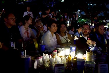 盧市長簡短40秒旋風式致詞,隨即鋪上野餐墊席地而坐,與貴賓一同享受台中美食,並和現場民眾熱情互動,一同享受爵士樂。「Enjoy it!」盧市長說,歡迎來台中爵士音樂節,一起共享美好夜晚。
