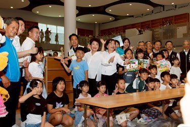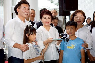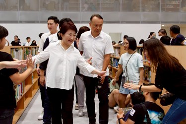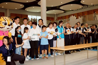 盧市長今日現場也親自參與傳書接力,與市民一同完成上架任務。她並分享好康訊息,為慶祝總圖書館開幕,市府準備限量紀念品,是由建築師妹島和世與西澤立衛設計的「花椅」造型鑰匙圈,並推出限量八萬張「貓貓蟲咖波」閱讀證,目前已申請超過五萬張,歡迎大家把握機會申請,作為紀念這座總圖書館啟用的特別象徵。她同時也感謝文化局與圖書館團隊的努力,及今日近千位市民家庭、志工與學校師生的熱情參與,讓市民共同完成「上架新書」這項充滿意義的文化行動。