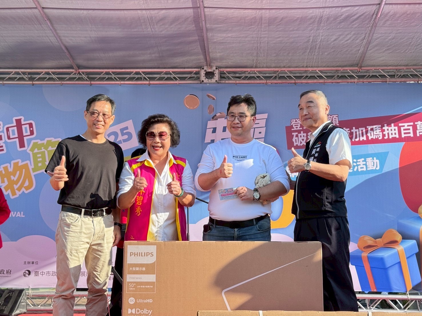 黃副市長說明,目前累計消費登錄金額已達239億元,不僅台中市民,各縣市民眾都來台中消費,台中購物節已成為全台不可錯過的消費盛會。同時也感謝歐盟、法國、捷克、芬蘭、菲律賓、印尼等6位駐台代表合力代言,更謝謝參與的民眾熱情支持購物節,拚全力瘋購物。