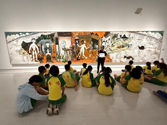 活動由具備專業藝術知能與豐富教學能力的巫雲鳳老師,依當期館內展出的作品設計導覽與教學活動,以輕鬆易懂的方式帶領學生探索展覽,從作品的形式、風格到材質表現,引導他們觀察細節並理解藝術家所欲傳達的情感與故事。