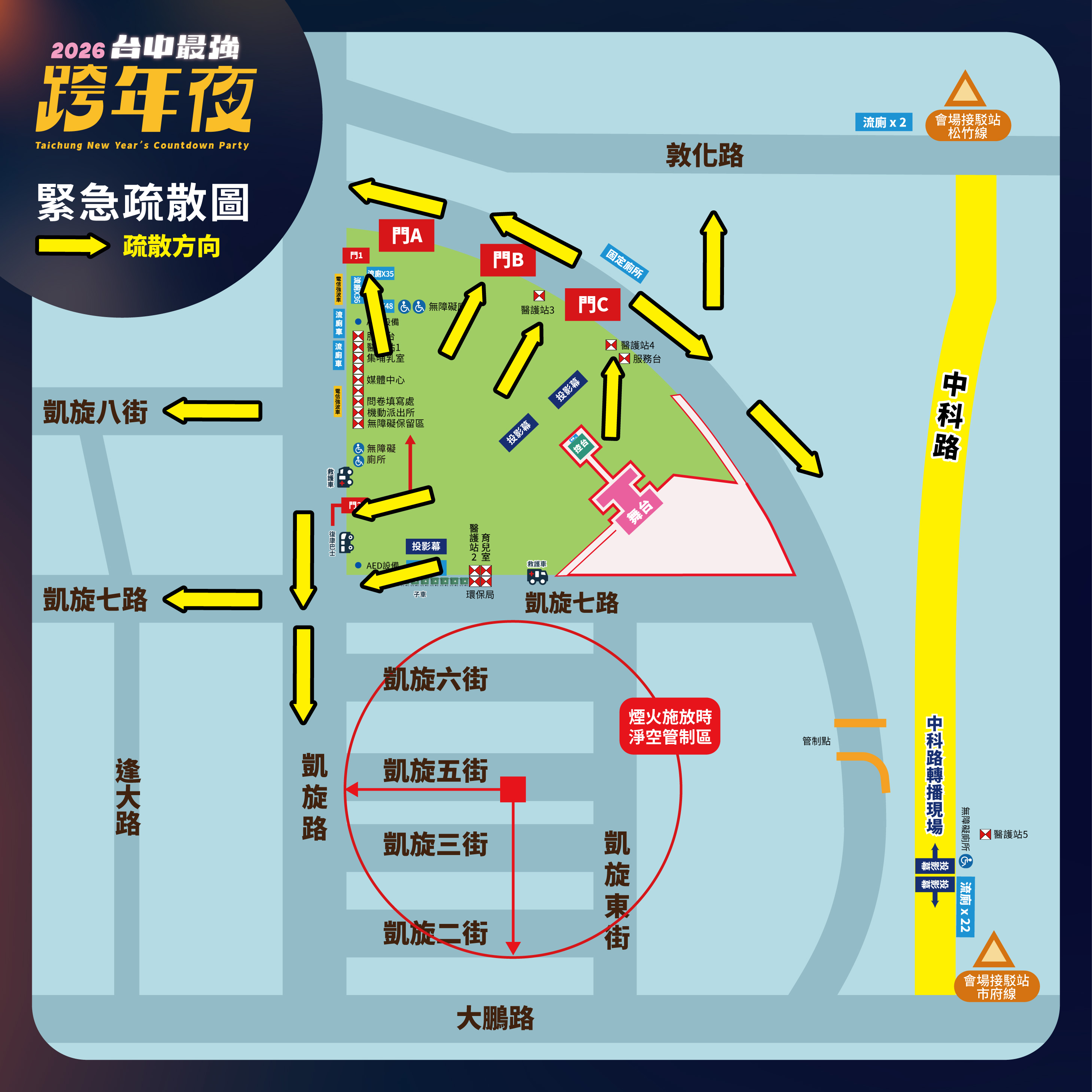 欒局長也強調,台中跨年晚會規模為全國最大,因應龐大參與人潮,市府全面升級維安層級,並已於昨(29)日完成跨局處聯合演練。活動當日將實施入場安檢,提醒民眾配合暫時脫口罩,切勿攜帶行李箱、易燃、易爆物品及刀械等危險物品;同時規劃兩種細胞簡訊機制,包含人數接近上限時的預防性通知,以及發生突發事件時的即時通報與疏散指引,請民眾收到簡訊時勿驚慌,並配合現場工作人員引導。