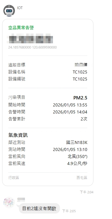 近期環保局試辦於金爐附近架設空氣品質感測器,如有空品不良情形將由系統推播提醒管理單位關閉金爐,避免燃燒紙錢造成空氣品質惡化,環保局也感謝各單位配合試辦此類科技管理模式,降低各種空氣污染源之排放,共同維護台中市空氣品質。