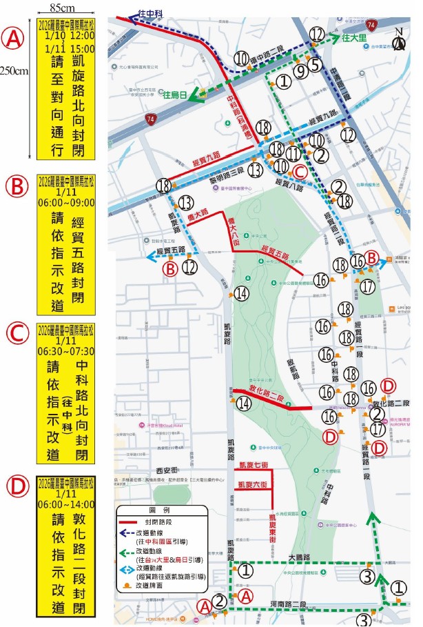台中市政府運動局表示,為確保賽事順利進行及交通疏運安全,將於1月11日6時至13時30分實施賽道沿線交通管制。賽道路線行經凱旋路、經貿九路、中科路(科湳愛情橋)、科雅路、科雅三路、科雅西路、潭雅神自行車道、月祥路、東大路、筏堤西一街、西屯路三段、筏堤東一街等路段,並通過AIMS國際賽道認證。為兼顧賽事競技性與安全性,全程馬拉松3小時30分內、半程馬拉松1小時45分內之菁英跑者將優先通行。