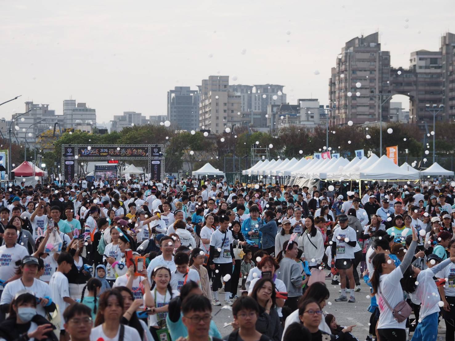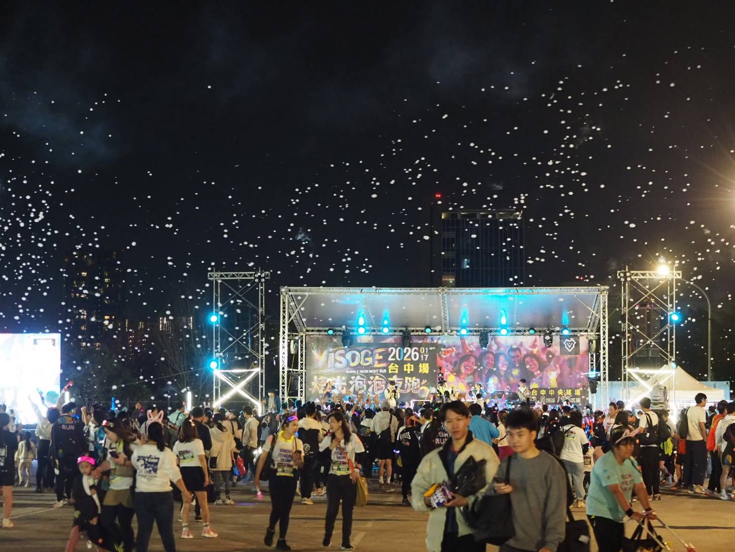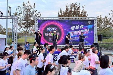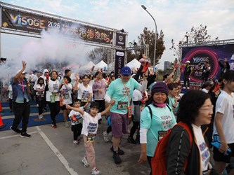DJ 音樂加上星光派對,最炫、最熱情的「VISOGE 炫光泡泡夜跑」今(17)日下午於中央球場登場,吸引逾五千名跑者與樂迷共襄盛舉。跑者們紛紛穿戴炫光髮箍、手燈、炫光棒等閃亮裝備,也有人塗上炫光顏料,環繞中央公園的賽道在夜幕中閃閃發亮,一掃冬日涼意。終點中央球場會場由 DJ 及樂團接力演出,跑者手持泡泡槍隨節奏搖擺,沉浸在五彩斑斕的星光派對中,享受輕鬆自在的運動時光。