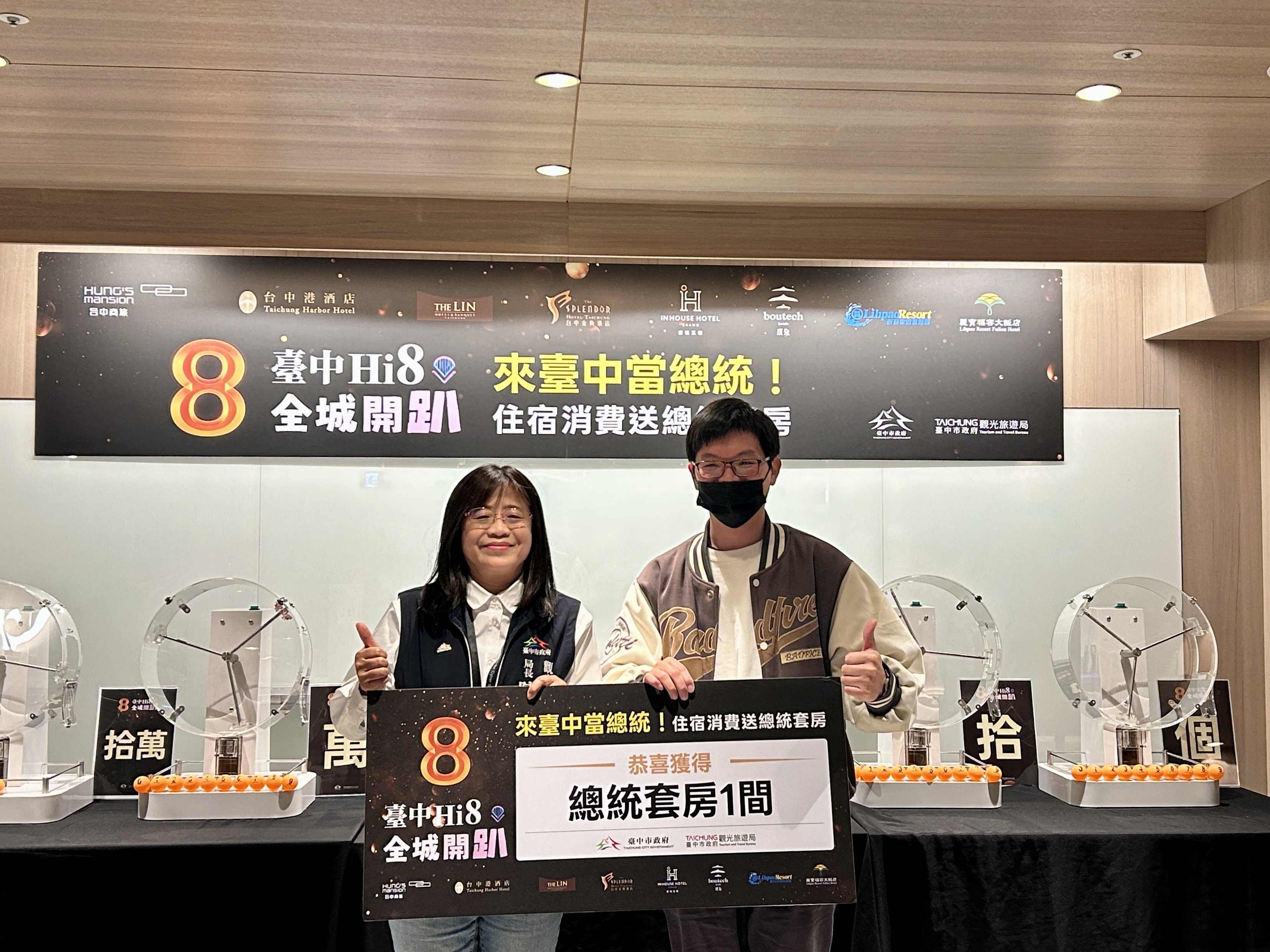 台中市政府觀光旅遊局推出「來台中當總統—住宿消費送總統套房」系列抽獎活動,第二場薆悅酒店總統套房住宿券抽獎今(18)日由觀光局、立法院江啟臣副院長服務處代表及薆悅酒店五權館代表抽出2名獲獎幸運兒!活動自去年12月26日起累積有效抽獎券共逾24萬張,顯示活動成功帶動住宿消費熱度,為台中觀光市場注入新一波動能。