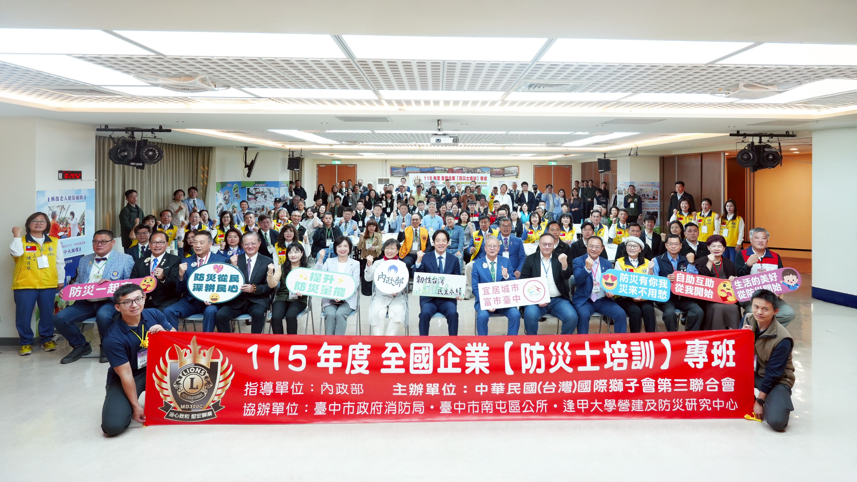 為強化企業防災韌性與社會整體應變能力,中華民國(台灣)國際獅子會第三聯合會(簡稱300複合區) 於昨(19)至今(20)日辦理全台首場以企業為主體的「防災士」培訓課程,並攜手內政部、台中市政府消防局及逢甲大學,共同推動產、官、學三方合作,邀集100位來自各行各業的企業負責人參與,透過系統化訓練,將防災觀念與實務技能向下扎根,成為企業永續經營的重要基石。