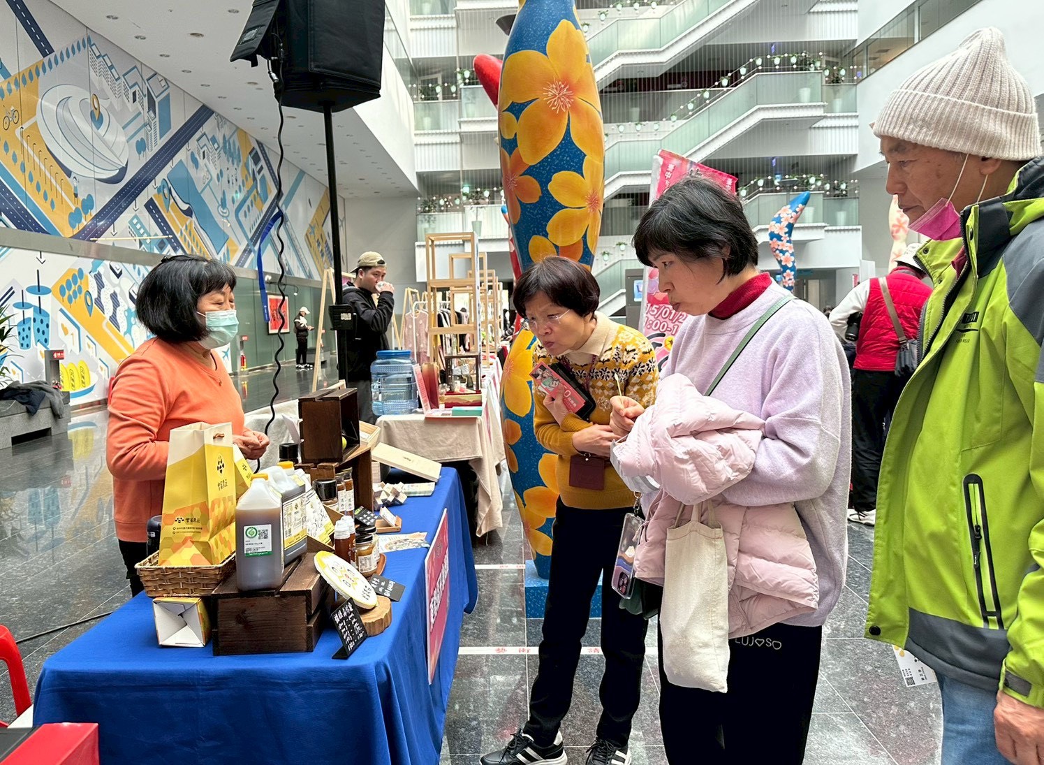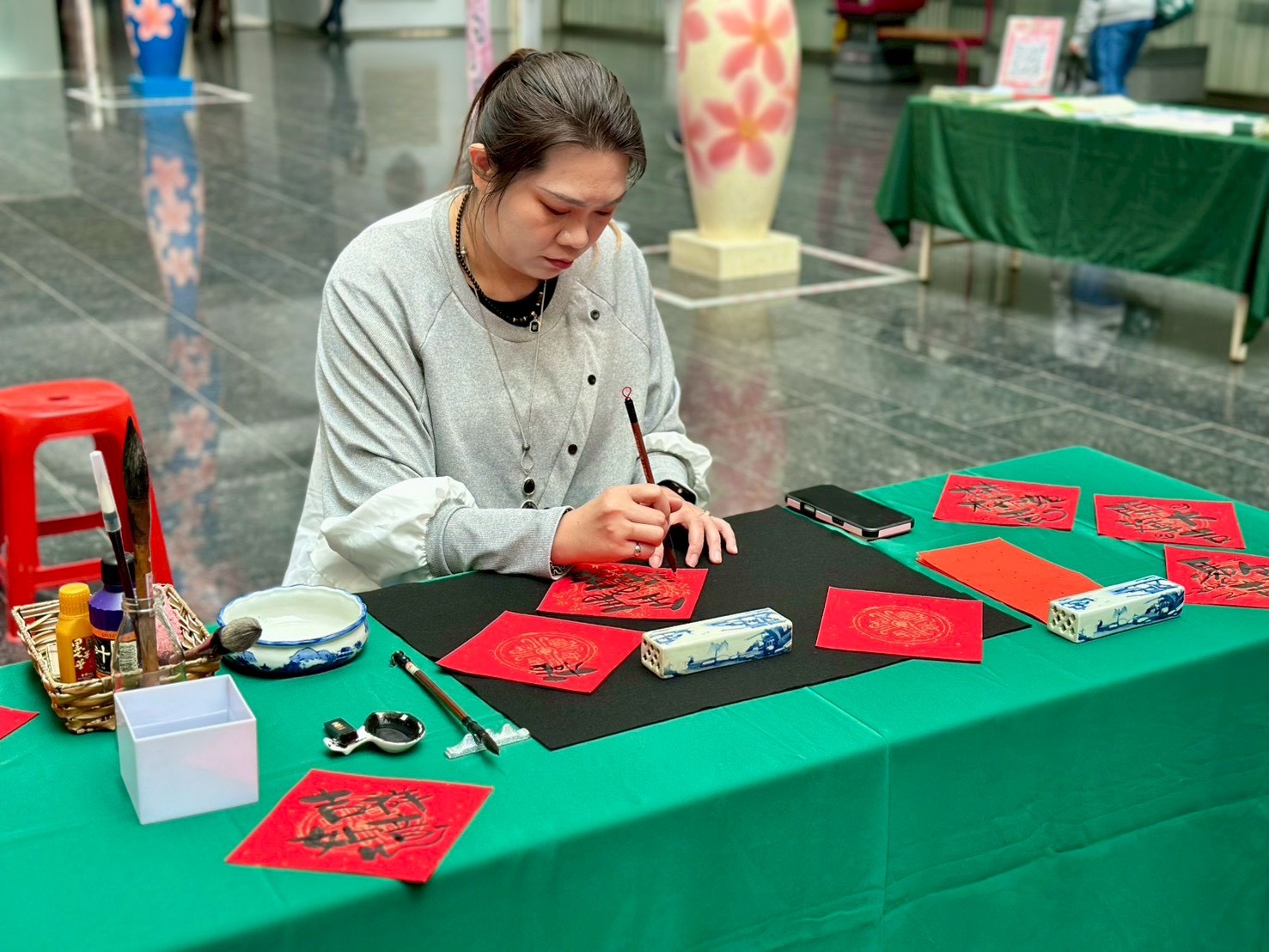 經發局補充,現場也由東海藝術街商圈專業茶師設置茶席,提供民眾品茶交流;適逢農曆年前夕,后里泰安商圈書法老師現場揮毫贈送春聯,提前營造濃厚年節氣氛,邀請市民朋友走出家門、走進商圈,感受在地消費的溫度與人情味。