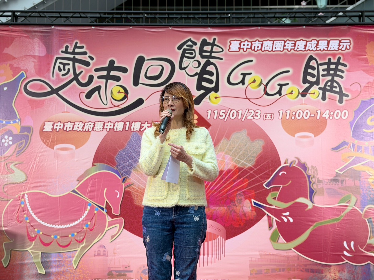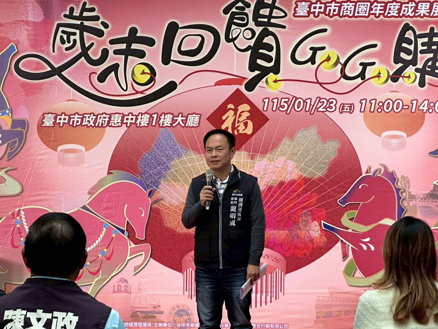 今日活動,包含經發局專門委員龍明成、社會局長廖靜芝、市議員陳政顯、劉士州、中區區公所區長林忠訓、東區區公所區長吳忠聖、西區區公所區長王瑞嘉、南區區公所區長王美麗、龍井區公所區長河宜真、后里區公所農業課課長陳碩甫、工策會專員連依覲、商圈聯誼會總召王允伶、台中商圈觀光產業聯合會理事長張聖明、一中商圈主委陳信志、美術園道商圈主委何正仁、大隆路商圈主委許瑞宏、繼光及逢甲商圈主委王朝藝、大坑商圈主委東正勝、昌平皮鞋商圈主委林世宗、東勢商圈理事長葉艾維、后里泰安商圈理事長劉雪美、東海藝術街商圈主委郭達鴻、大甲商圈主委許慈芸、太平樹孝商圈主委劉家寧、大里中興商圈主委洪明凱、精明一街商圈副主委蔣群翔、電子街商圈總幹事劉修成、和平谷關商圈總幹事歐文恭、新社商圈秘書吳怡旻、豐原廟東復興商圈總幹事吳燈全、台中港舶來品商圈總幹事馬瑞成等人親自出席,立法院副院長江啟臣、立委羅廷瑋、市議員李中、陳文政、陳清龍也派代表出席共襄盛舉。