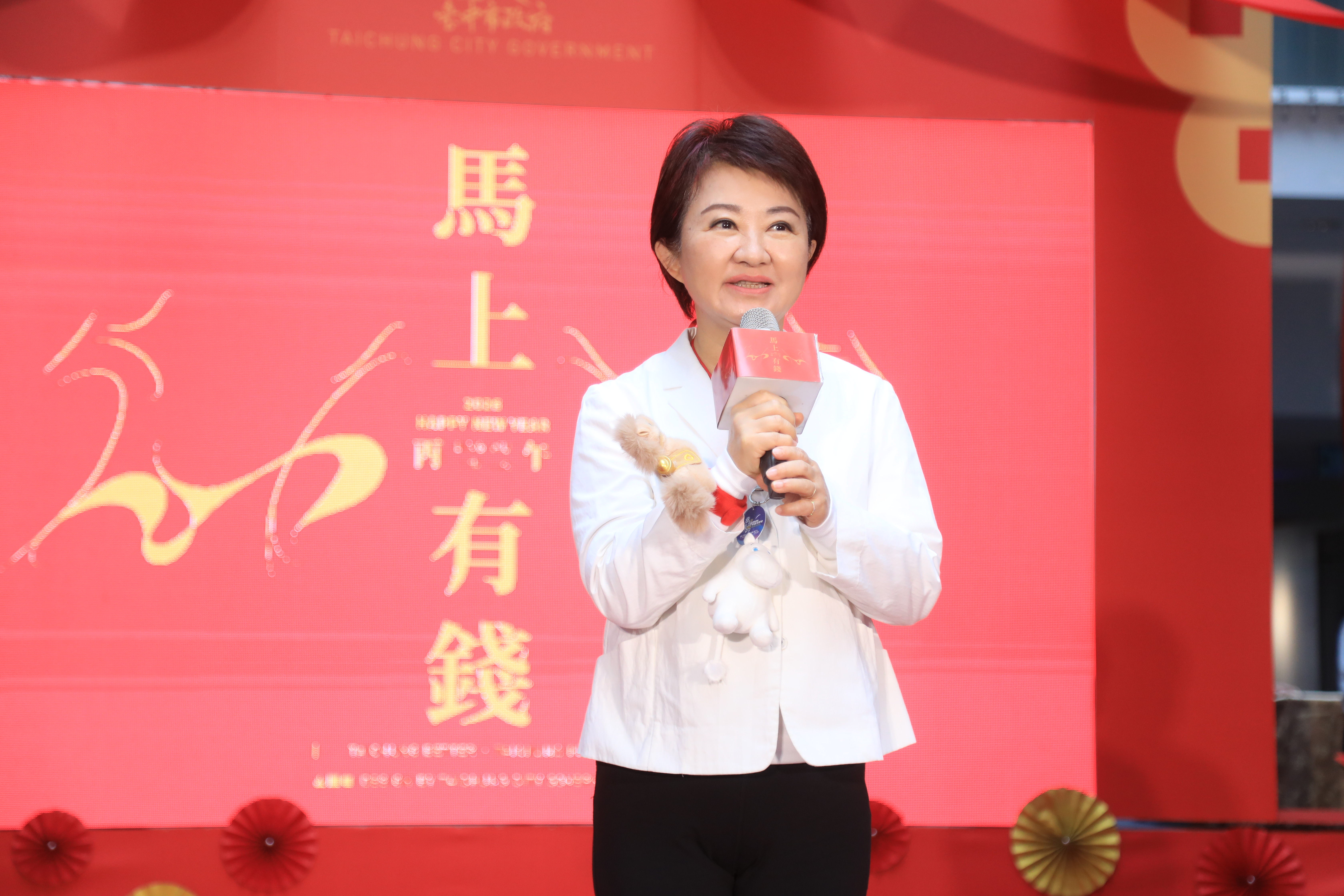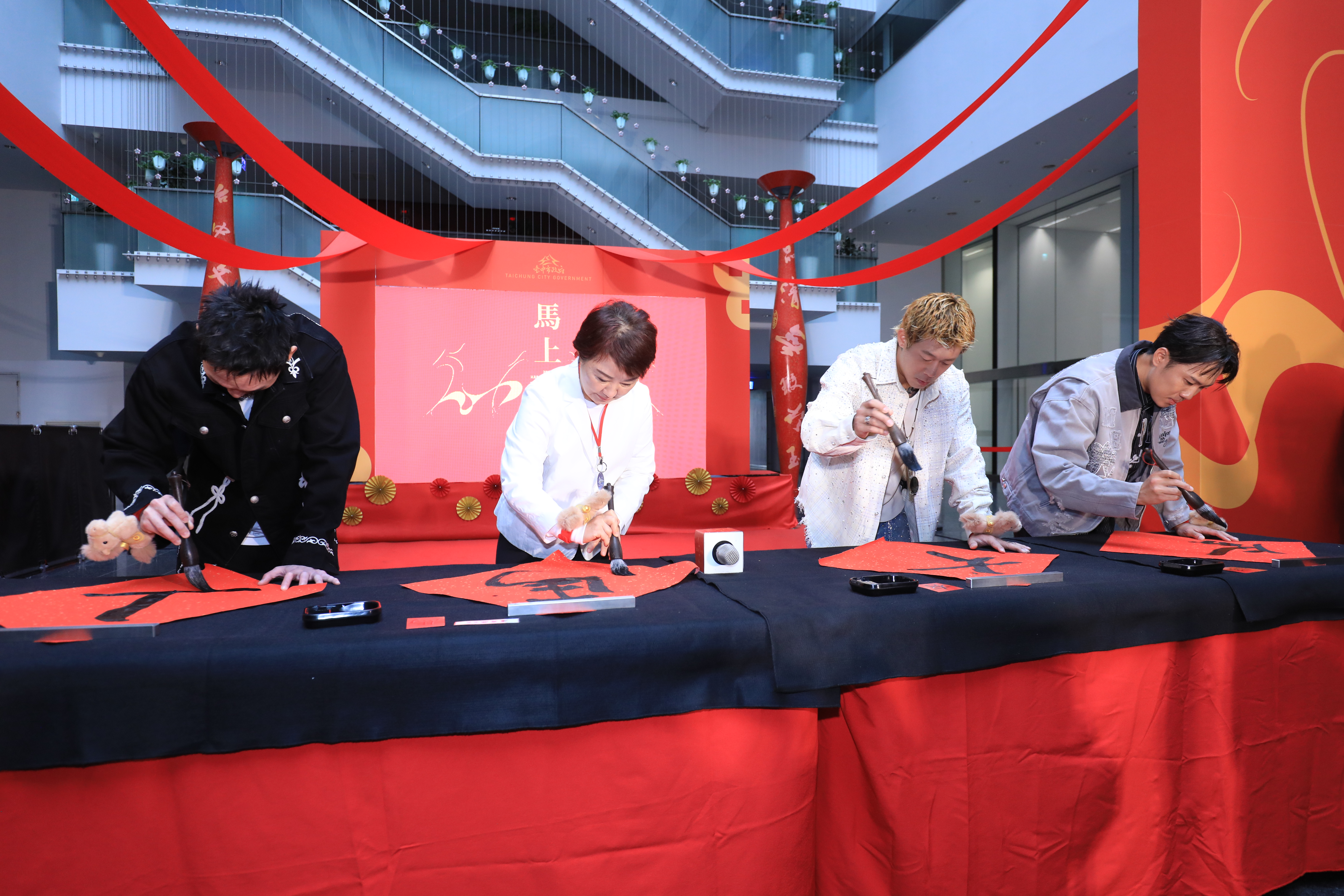 台中市政府今(26)日舉行「台中市政府115年迎新揮毫贈春聯」活動記者會,市長盧秀燕與台中在地天團玖壹壹現場揮毫,公布三大驚喜彩蛋,包括邀請知名天團玖壹壹為台中書寫馬年春聯、除家戶版「馬上有錢」外,揭曉兩款隱藏版「超級馬利」及「龍馬有春」限量發送;此外,更邀請兩位全國語文競賽特優學生,為台中書寫單字春聯「春」與「福」,象徵欣欣向榮、福氣來到的好兆頭。