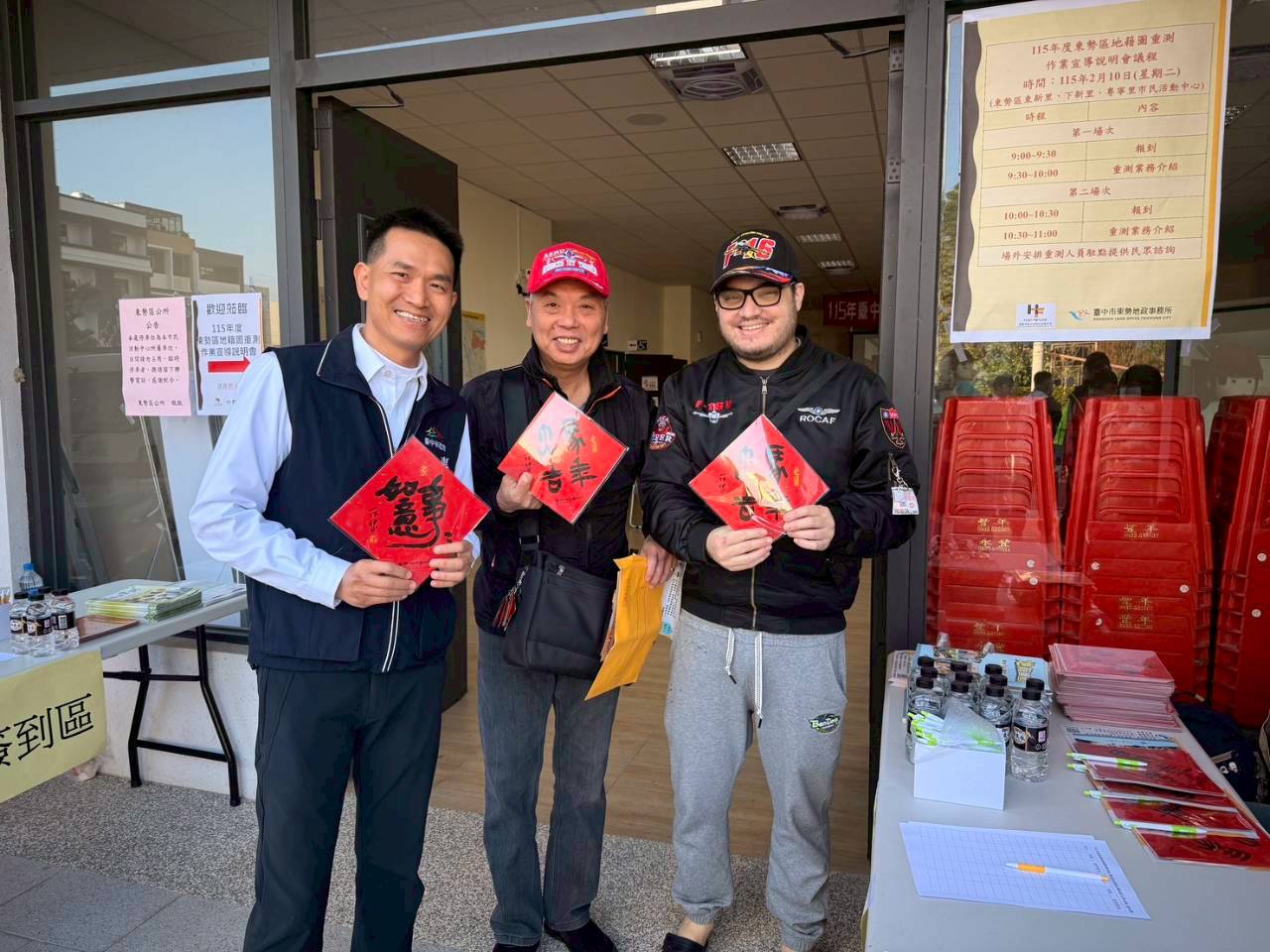 東勢地政所主任陳應欽也提到,重測工作委外辦理,均有配戴識別證穿著背心,指界釘樁與換發所有權狀都是免費,如有遇詐騙或相關疑問均可電洽地政事務所查證。由於宣導會時程接近農曆春節,東勢地政所特別準備「事事如意」、「馬年大吉」春聯於會場發送,民眾在了解政策之餘,也感受濃厚的年節氛圍。(2/11*4)*地政局