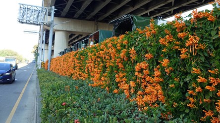 環保局表示,中西區清潔隊環保友善停車場於111年興建時,即導入資源循環再利用材料規劃設計,並種植大量綠化植栽與炮仗花,兼顧環保理念與景觀美化。在同仁細心養護下,並施以外埔綠能生態園區沼液作為天然肥料,炮仗花一年比一年繁盛,逐步形成壯觀的火紅花牆,不僅美化環境,也提升城市整體景觀品質。班長徐堡基表示,植栽由機動班負責日常維護,透過持續澆水與施肥,讓炮仗花在每年農曆年前準時綻放,營造喜氣洋洋的過年氛圍,同仁也從中獲得成就感。