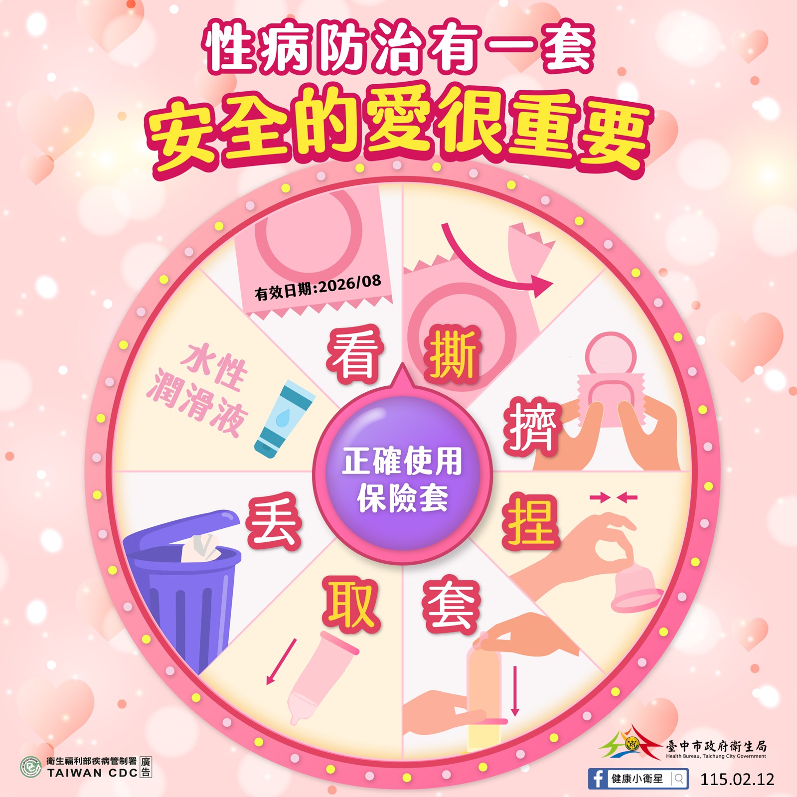 西洋情人節適逢春節連假,伴侶間約會與親密互動增加。台中市政府衛生局提醒,愛滋病毒(HIV)、梅毒及淋病等性傳染病感染不限特定性別或性傾向,只要未落實安全性行為,皆有感染風險。為守護自己與伴侶健康,應正確使用保險套並定期篩檢,讓愛更安心、更長久。