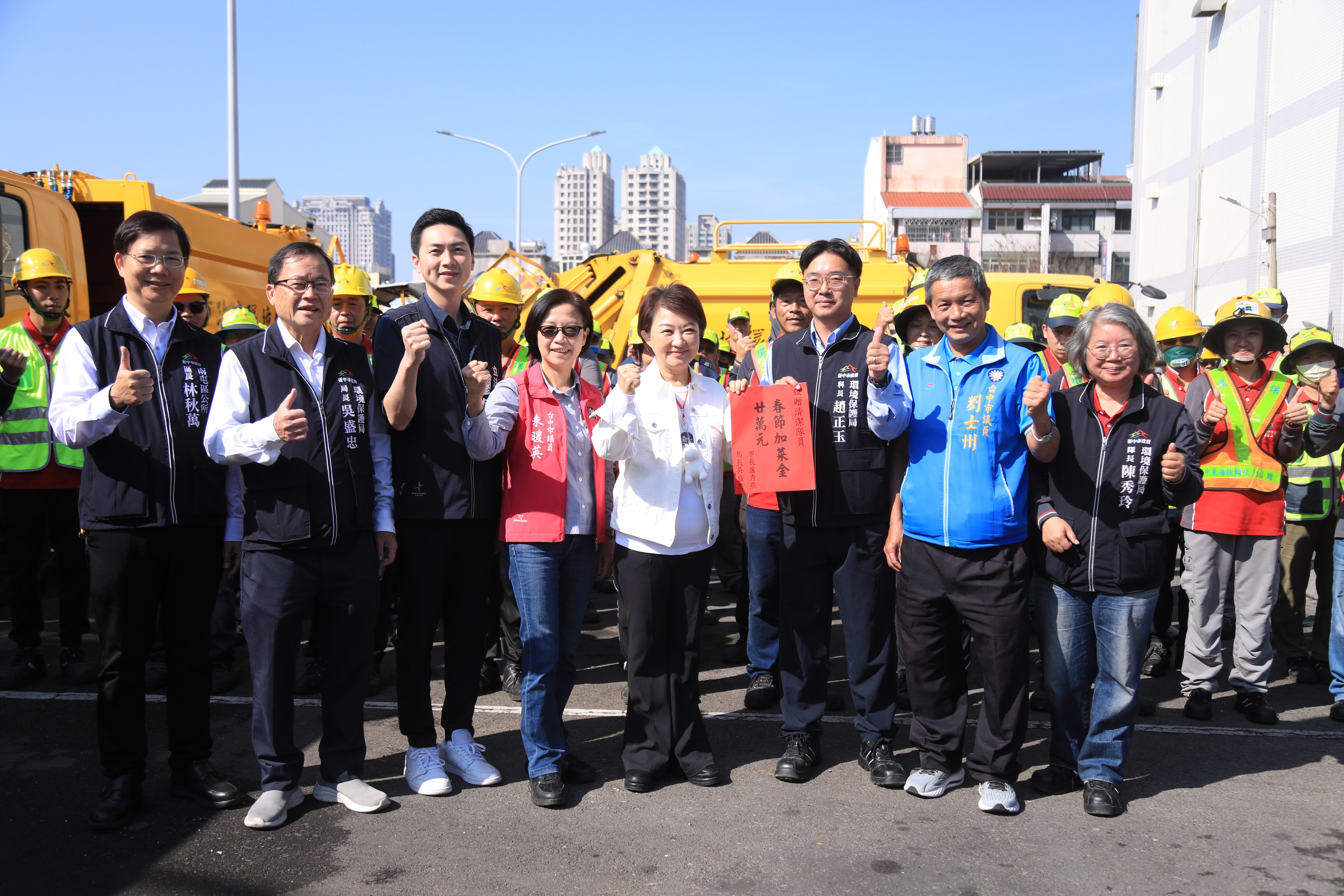 農曆春節將至,家家戶戶忙著除舊布新、迎接新年,也是清潔隊員一年當中最繁忙的時刻。市長盧秀燕今(14)日年假第一天特地前往南屯區清潔隊,親自向堅守崗位的第一線清潔人員表達關懷與感謝,並致贈加菜金新台幣20萬元,向環保英雄致上最誠摯謝意:「加油,謝謝,新年快樂!」