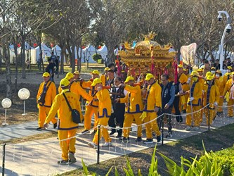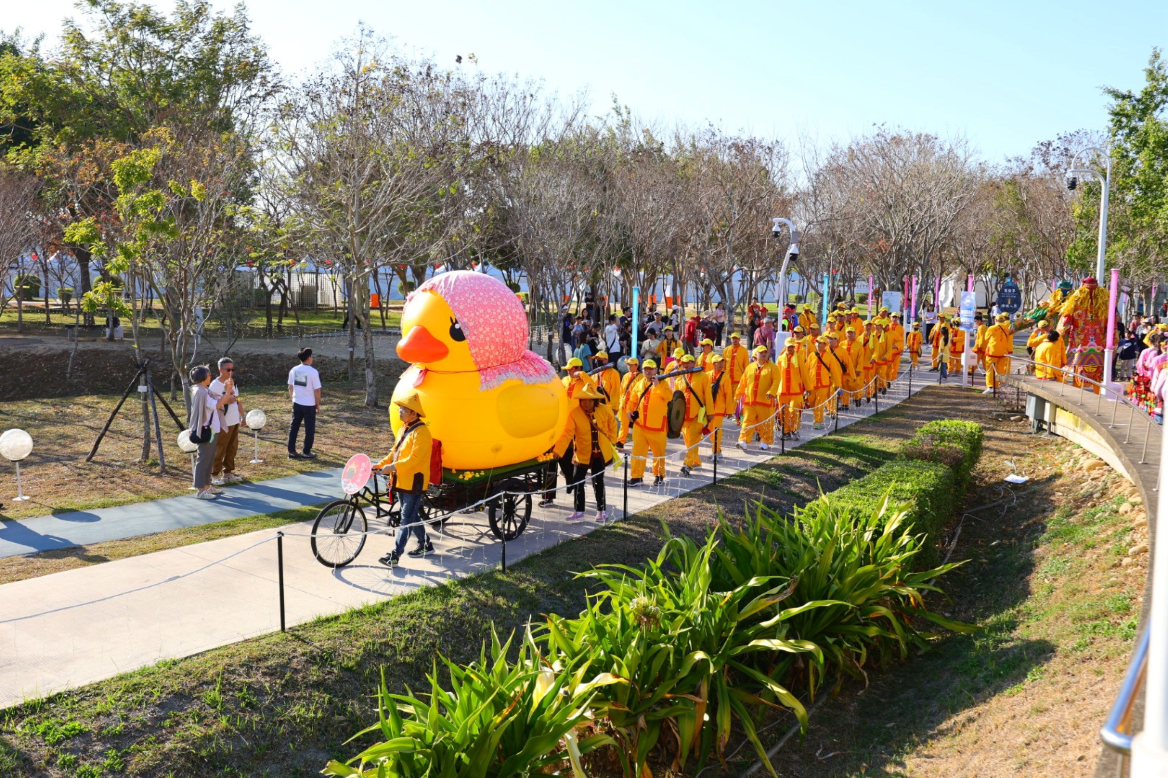 民政局說明,「鴨母寮媽」遶境隊伍於下午3時30分抵達啟航路與經貿三路二段路口,由吳局長親自接駕,在鴨咪仔鼓、永天小鴨義工班、哨角班、將軍班、仙女班及大轎班引領下,媽祖神轎緩步前行,200名信眾虔誠隨行,隊伍依序遶行主燈區,跨橋進入「幸福祈願村」燈區,最終駐駕於海線祈福燈組「永天光耀」前,沿途鑼鼓齊鳴、秩序井然,不少民眾駐足觀禮並以手機記錄盛況,展現宗教文化與燈會活動相互融合的祈福意象。