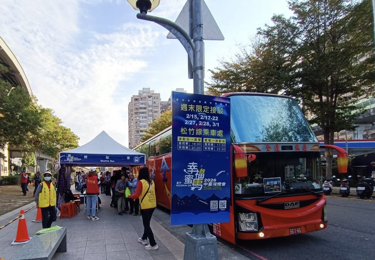 2026中台灣燈會「幸福蜜馬」昨(15)日於水湳中央公園璀璨開幕,超人氣「姆明一族(The Moomins)」燈區吸引大批民眾湧入賞燈拍照,現場洋溢春節熱鬧氣氛。台中市政府交通局長葉昭甫表示,首日接駁車搭乘踴躍,共計發出近百班次,雖逢人潮高峰,交通疏運順𣈱。除今(16)日為農曆除夕休展外,春節期間「市府線」及「松竹線」2條接駁路線,分別於2月17日至22日,2月27日至3月1日免費提供服務,歡迎市民賞燈迎春,搭大眾運輸最省時又便利。