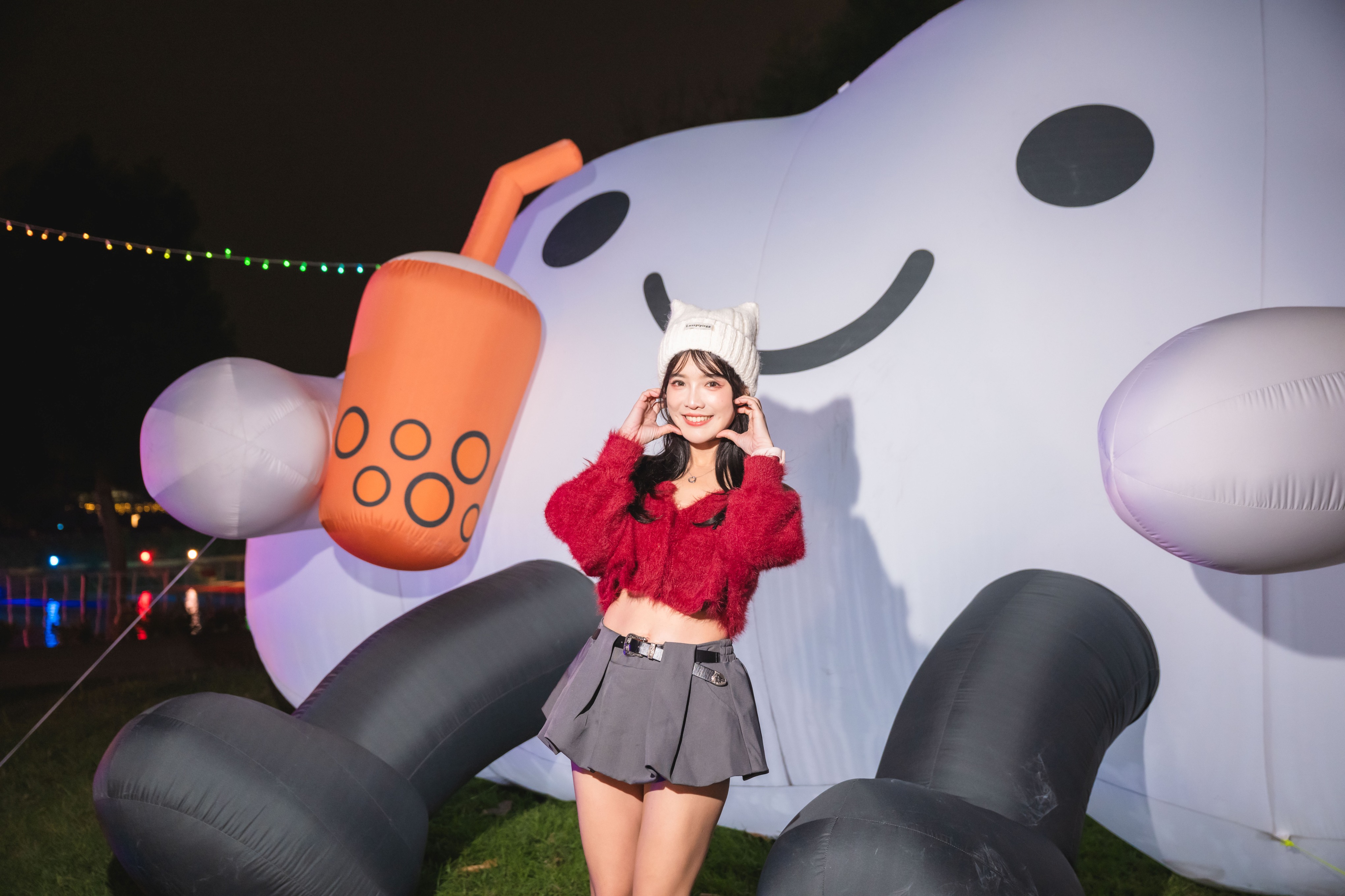 此外,屯區以霧峰益全香米釀造的「初霧‧純米吟釀」清酒燈組結合金黃稻穗,象徵豐收與甘甜生活;城區則以中區中山路舊稱「鈴蘭通」為發想,高掛鈴蘭花燈並融入夜市小吃文化,其中啵啵雲喝珍奶坐在草地上的俏皮造型,更成為遊客必拍的療癒打卡亮點。