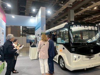 台中智慧交通再升級!台中市政府交通局在水湳經貿園區打造自駕巴士示範路線,串聯水湳轉運中心與捷運文華高中站,展現具體成果。3月17日到20日在台北南港展覽館2026智慧城市展(Smart City Summit & Expo)首度實車展示,成為全場超人氣的亮點。交通局表示,全電動低碳設計的自駕巴士,預計今年秋天正式上路,並開放民眾預約免費搭乘,搶先體驗未來交通新模式。