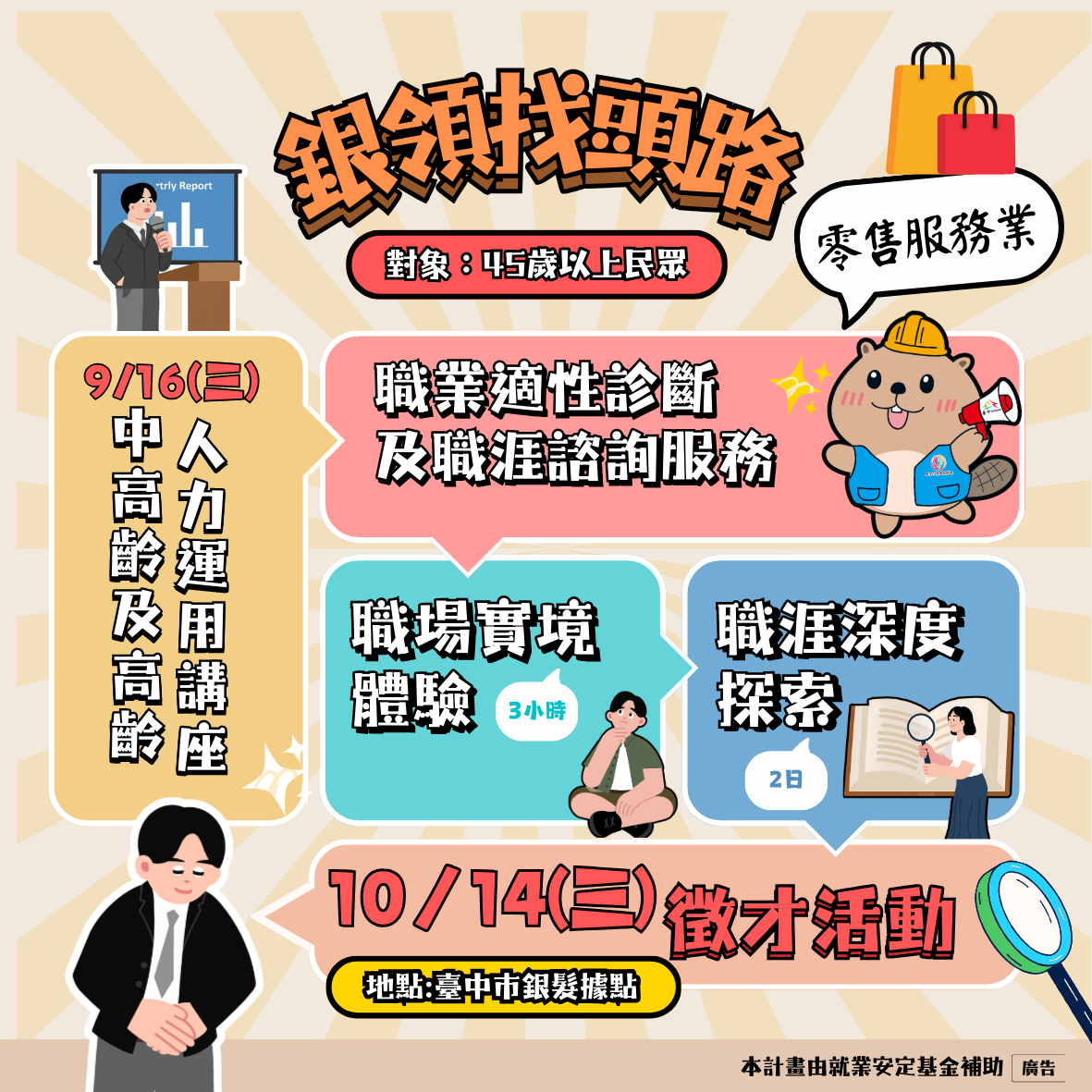 中市就業服務處表示,今年首度推出「銀領找頭路」套裝式活動,打破過往單點式的課程規劃,特別以中高齡求職者詢問度最高的餐飲服務業、零售服務業為主題,以中高齡及高齡人力運用講座開場、銜接職業適性診斷及職涯諮詢服務、3小時職場實境體驗或2日職涯深度探索,最後透過銀髮據點聯合徵才等活動,引領銀髮者更深度瞭解相關產業的就業環境、工作內容、所需具備專長及技能,強化銀髮求職者就業動機,重新進入勞動市場。