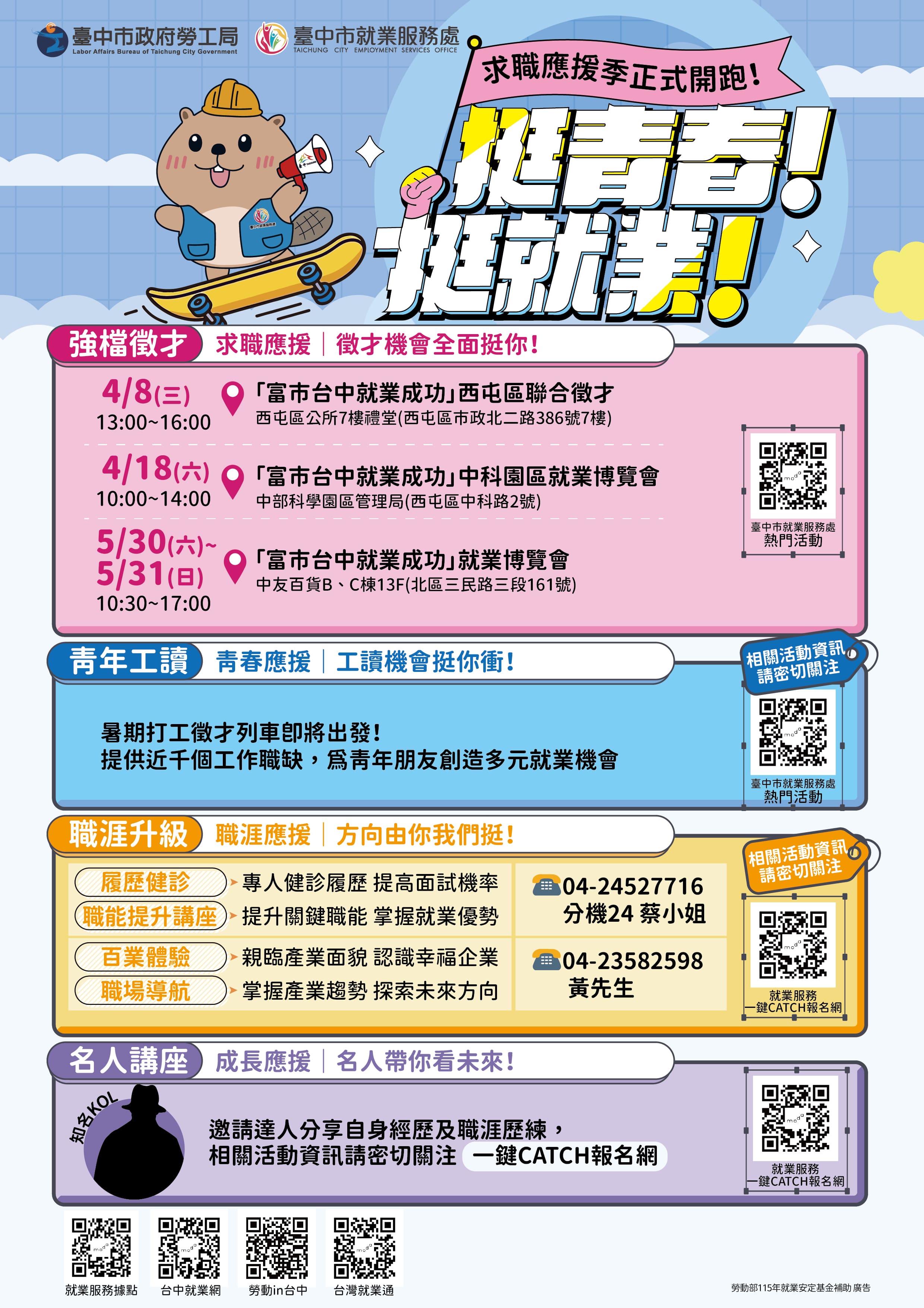 台中市政府勞工局為協助市民及青年朋友順利銜接職場,自4月起推出「求職應援季」,整合系列徵才活動、暑期工讀、職涯升級及名人講座等多元服務,全面應援求職需求。首波辦理「富市台中 就業成功」4月系列徵才活動,邀集台積電、矽品精密、綠茵生技及香繼光等60家次廠商共襄盛舉,規劃20場徵才活動,提供超過2,200個優質職缺,歡迎市民朋友踴躍參加。