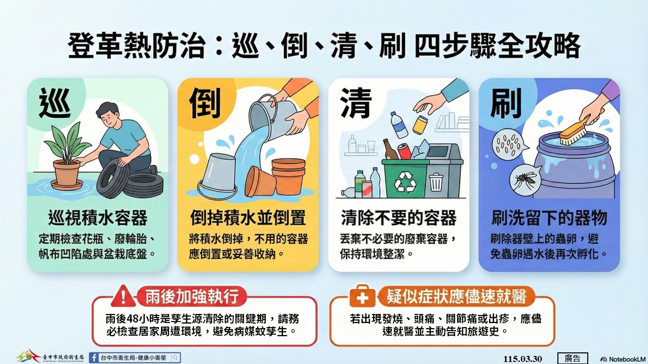 衛生局呼籲,國內陸續有境外移入登革熱確診個案,依據氣象局資訊顯示,清明連假時,國內可能有連續降雨的機會,另隨著氣溫逐漸上升,國內已進入登革熱流行期,提醒市民不可輕忽登革熱疫情風險,定期落實居家週邊環境「巡」、「倒」、「清」、「刷」,雨後48小時內,請務必落實孳生源清除及容器減量,有關登革熱、恙蟲病等法定傳染病相關資訊可至疾病管制署全球資訊網( http://www.cdc.gov.tw/ )查詢,或撥打免費疫情專線1922洽詢。(3/30*15)*衛生局