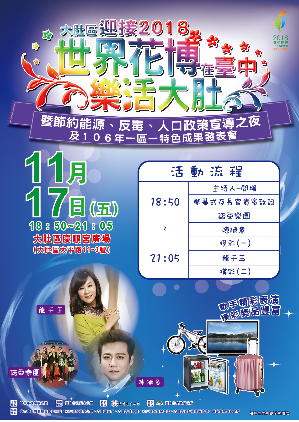 另外,「小鎮藝術節」自17日至26日在豐原葫蘆墩文化中心登場,10天內邀請國樂、原住民歌舞、客家樂曲、劇團等共12個優秀藝文團隊演出,活動免費參加,演出前1小時至葫蘆墩文化中心演奏廳大門索票入場。除了表演場次,活動也結合30個社區文創手作市集、社區藝文展覽,內容豐富。活動詳細資訊請至葫蘆墩文化中心網站( http://bit.ly/2zOGkGW  )的演藝活動,或小鎮藝術節臉書( http://bit.ly/2zJdASl  ) 查詢。