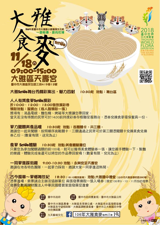 「2017年大雅小麥麵食文化節」今年由達達、雅雅及大雅區公所領隊,帶著九天民俗技藝團與一共18組在地團體,融入當地大雅小麥特色、結合花博變裝,永興宮媽祖娘娘也一同踩街,現場還有一連串不間斷的精采表演,主辦單位並特別準備食麥環保餐具,送給參與當天活動的民眾。詳細內容可至活動網頁( http://bit.ly/2z8MG6O  )查詢。