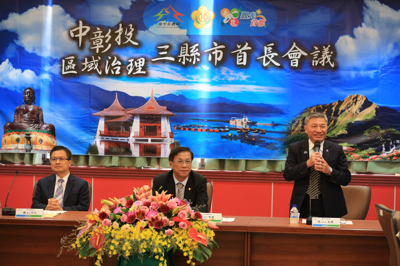 中彰投三縣市第4次首長會議今(7)日移師南投,台中市副市長張光瑤代表市長林佳龍,與彰化縣長魏明谷、南投縣長林明溱共同與會,會中達成6項合作共識;此外,今日適逢中興會堂展出「2015南投世界茶業博覽會」,三位縣市首長副首長除一起品茗,更共同行銷三縣市的農特產品,盼未來中彰投在交通、文化、觀光、災防等各面向能有更緊密實質的合作,創造三贏。